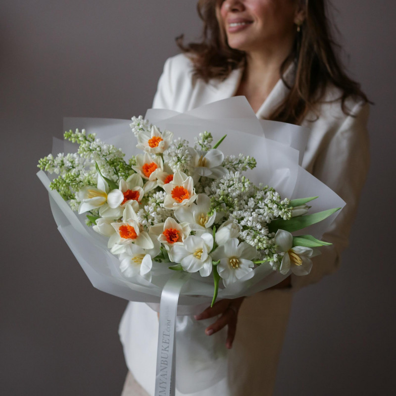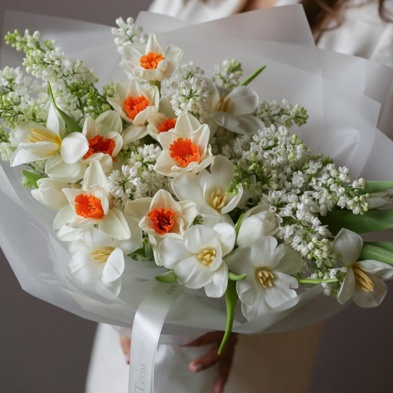 Ароматный весенний букет с белой сиренью, тюльпанами и нарциссами в нежно-молочной полупрозрачной упаковке. Декорирован длинными лентами.