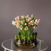 Авторская композиция-дуэт с луковичными гиацинтами, нарциссами и тюльпанами PEACH FUZZ в металлическом блюде. Декорирован длинной лентой.