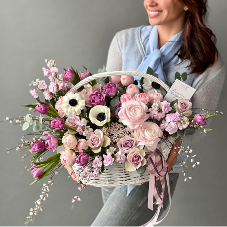 Мечтательная и романтичная корзина с анемонами и ранункулюсами. Бережно собрана в плетеной корзине.