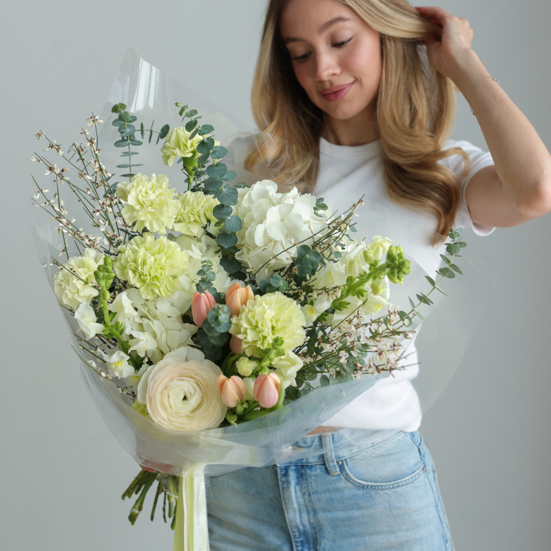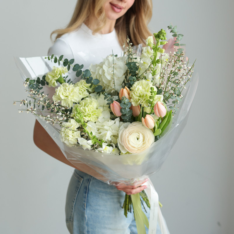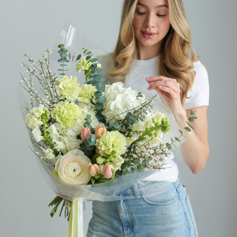 Нежный весенний букет со светло-зелёным диантусом, тюльпанами и ранункулюсом — свежий, лёгкий и воздушный. Гортензия придаёт объём и мягкость, диантус и ранункулюс создают текстуру и изысканность, а гениста и эвкалипт добавляют свежесть и гармонию. Полупрозрачная упаковка с длинными лентами подчёркивает чистоту оттенков и округлую форму букета. Идеален для дня рождения, комплимента или как весенний знак внимания без повода.