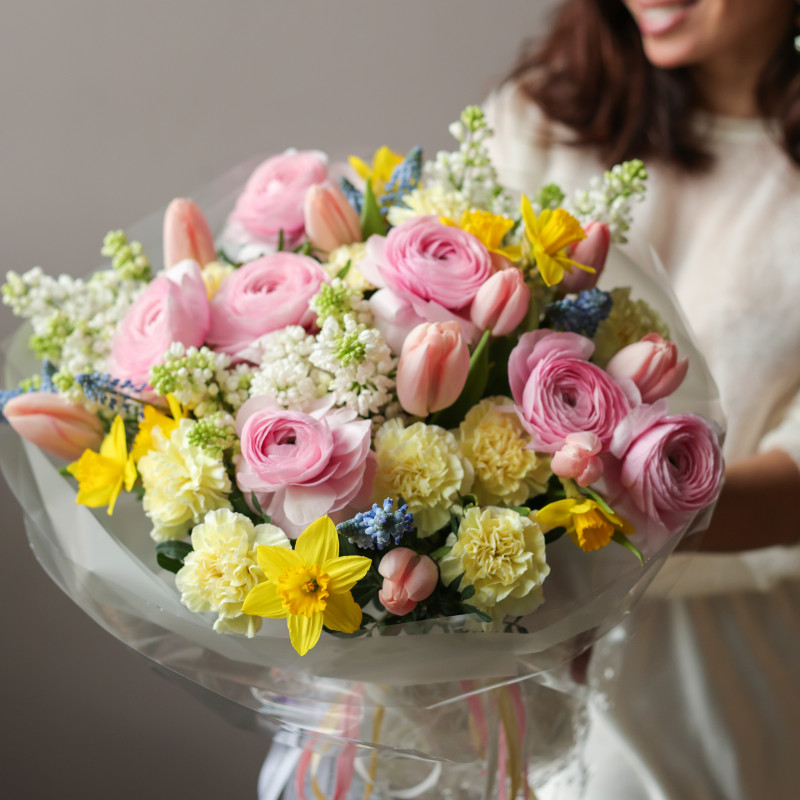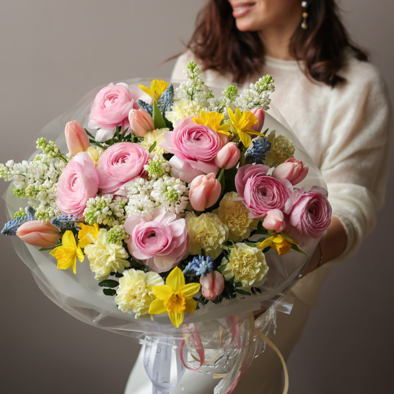 Яркий весенний букет с живой игрой оттенков и фактур. Розовые ранункулюсы создают мягкий объём и глубину, белая ароматная сирень наполняет композицию тонким весенним ароматом, ярко-жёлтые нарциссы добавляют солнечную энергию, лососевые тюльпаны смягчают палитру тёплым акцентом, нежно-жёлтые диантусы поддерживают цветовую гармонию, а голубые мускари вносят свежий небесный контраст. Круглая форма подчёркивает аккуратность и цельность композиции.