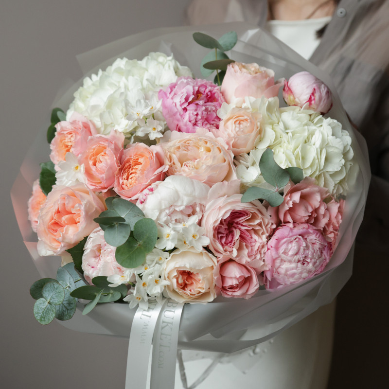 Трогательный и нежный букет с пионовидными розами и гортензией. Бережно упакован в дизайнерскую бумагу и декорирован длинными лентами.