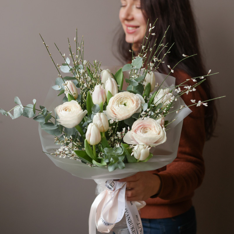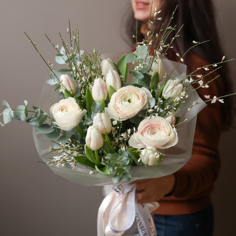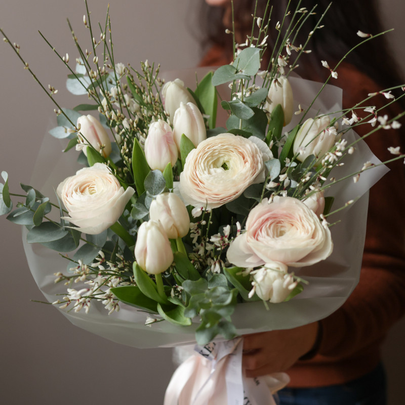 Весенний букет с ранункулюсами и тюльпанами — лёгкая, свежая композиция, наполненная ощущением пробуждения и нежности. Многослойные лепестки ранункулюсов красиво перекликаются с лаконичными тюльпанами, создавая гармонию формы и объёма. Эвкалипт добавляет прохладную зелёную ноту, а гениста — лёгкую воздушность. Такой букет идеально подойдёт для весеннего поздравления, знака внимания без повода или как стильный подарок, который говорит о чувствах мягко и искренне.
