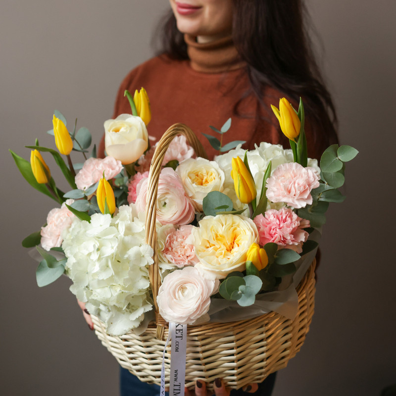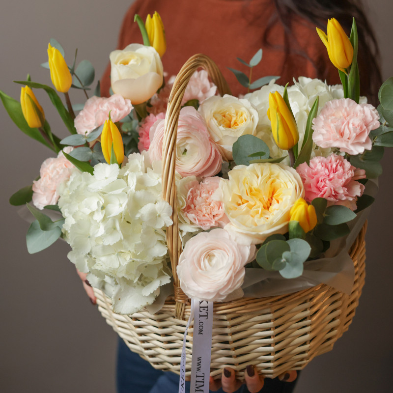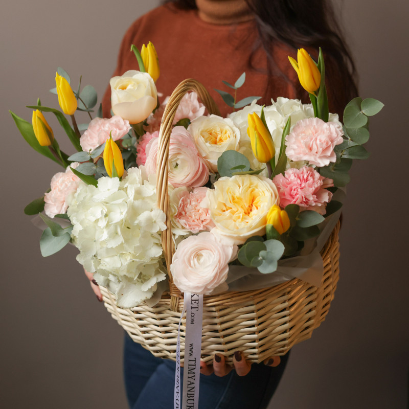 Весенняя композиция в плетёной корзинке с ручкой с ранункулюсами, жёлтыми тюльпанами и пионовидными розами — тёплый, солнечный акцент, наполненный ощущением обновления и радости. Белая гортензия придаёт композиции воздушность и мягкий объём, а диантус добавляет фактурные штрихи и лёгкую игривость. Яркие жёлтые оттенки символизируют свет, энергию и хорошее настроение, а плетёная корзинка делает композицию особенно уютной и интерьерной. Идеально подойдёт для весеннего подарка, украшения дома, поздравления с Днём рождения, 8 Марта или как знак внимания без повода.