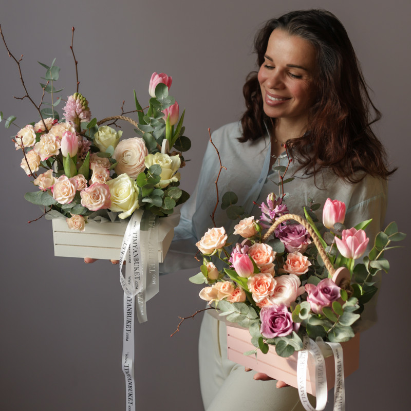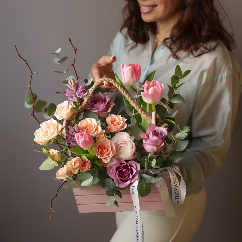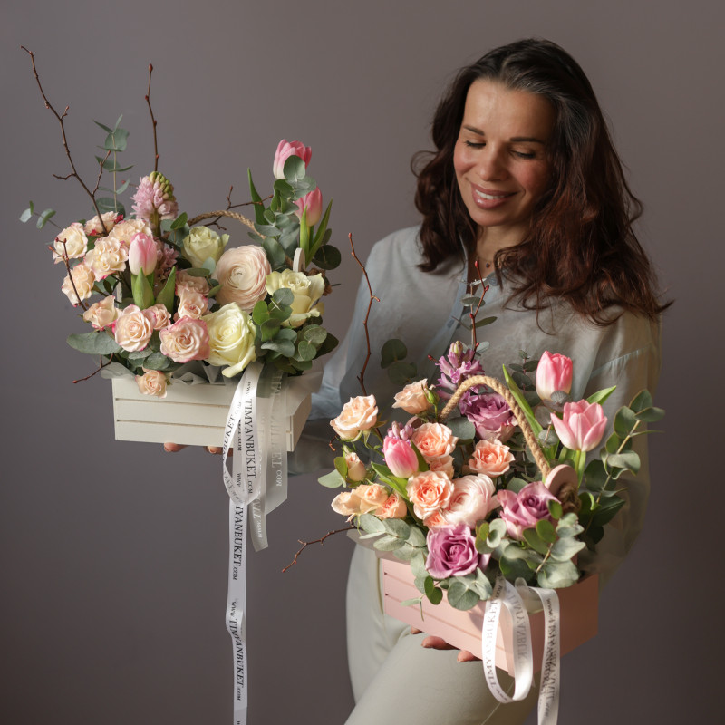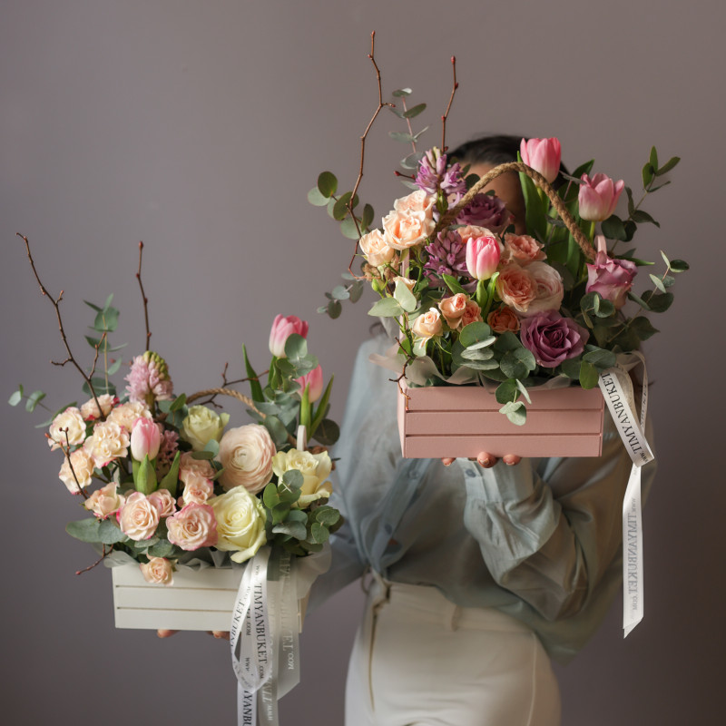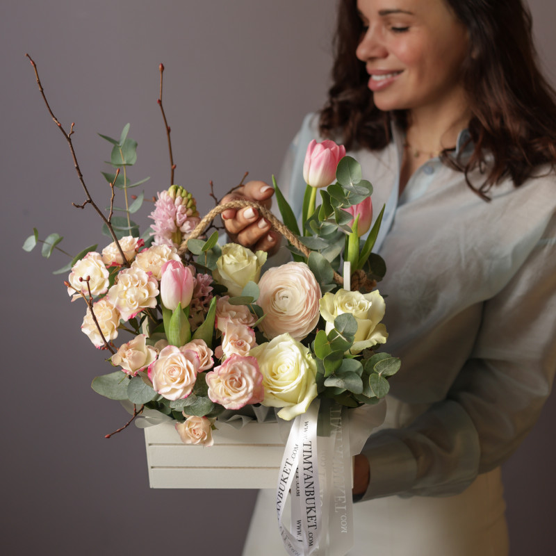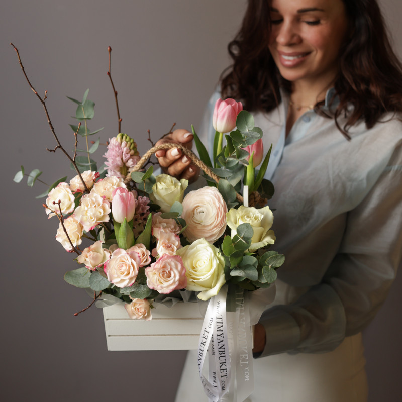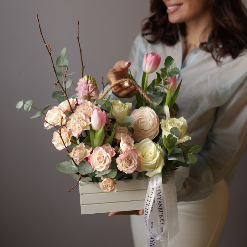 Весенняя композиция в деревянном ящичке с гиацинтами и тюльпанами