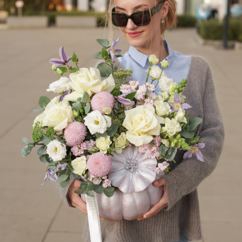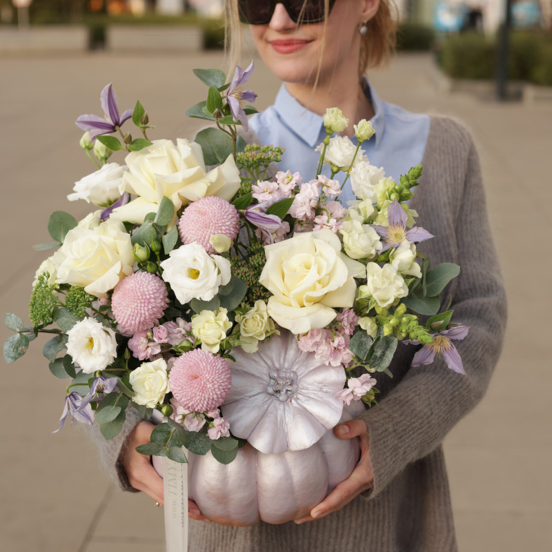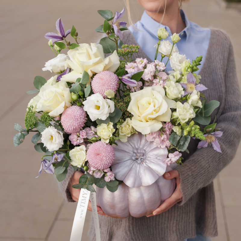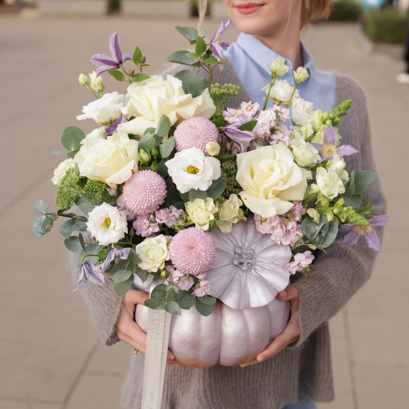 Нежная осенняя композиция в настоящей тыкве, окрашенной в пудрово-сиреневый оттенок, с изысканным миксом кремовых роз, воздушной эустомы, сиреневой маттиолы, лавандового клематиса и розовых шариков хризантем. Лёгкая зелень эвкалипта завершает образ, добавляя свежести и прозрачности.