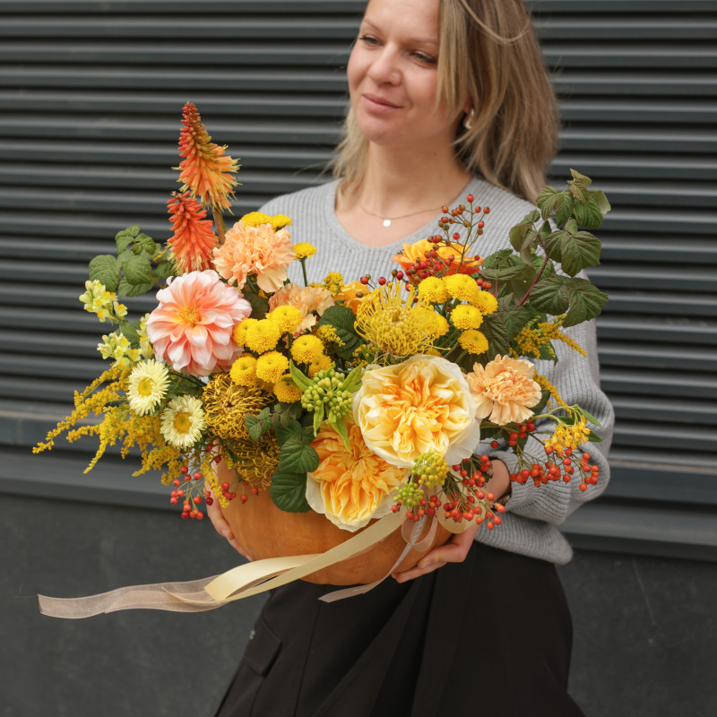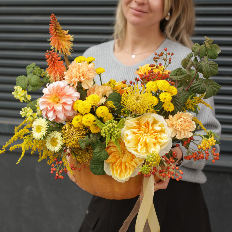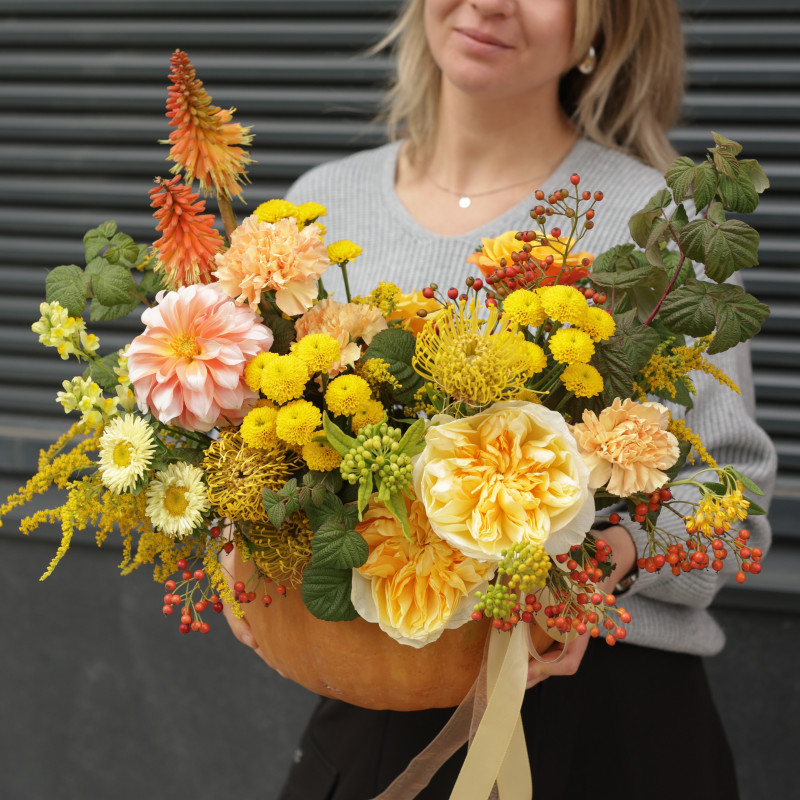 Особенности: свежие сезонные цветы, естественное оформление в настоящей тыкве, солнечная палитра, готовая композиция для подарка или декора.