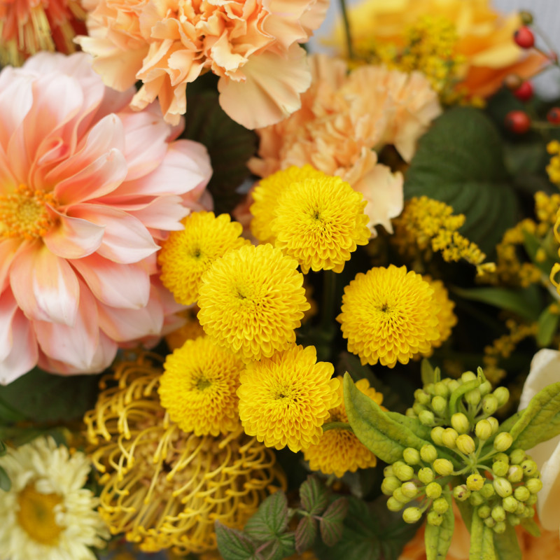 Состав: садовые розы жёлтых оттенков, георгины, оранжевые гвоздики, хризантемы, книфофия, декоративные ягоды, декоративная зелень.