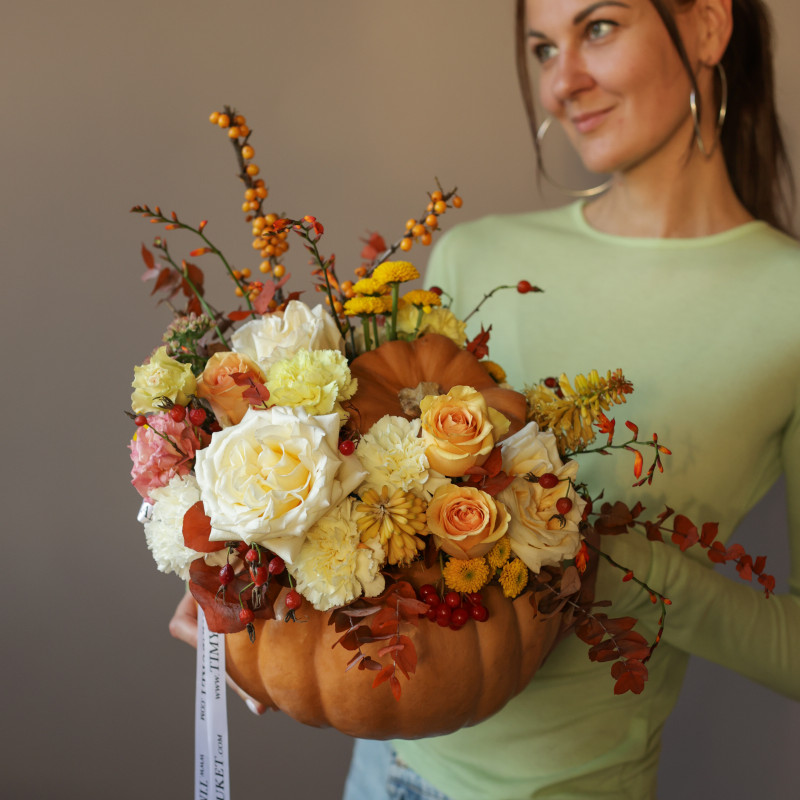 Особенности: свежие сезонные цветы, оригинальное оформление в натуральной тыкве, насыщенная осенняя палитра, готовая композиция для подарка или украшения интерьера.