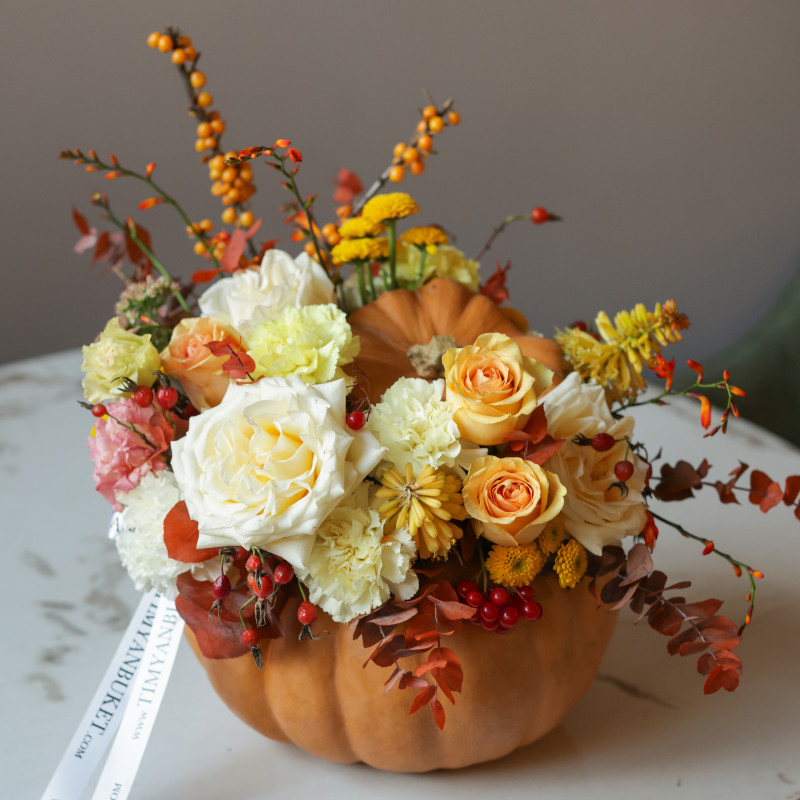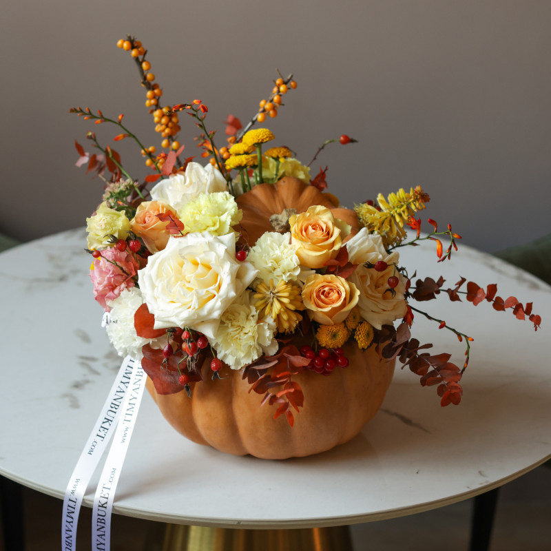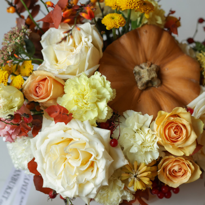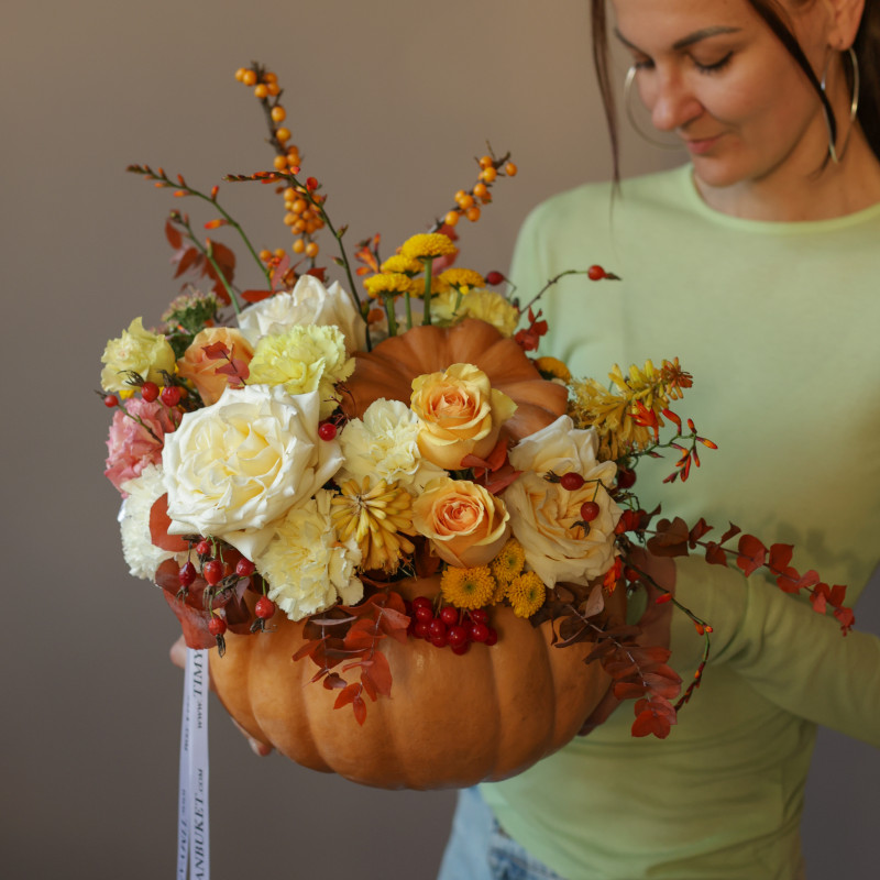 Яркая жёлто-оранжевая композиция в настоящей тыкве — солнечный акцент для дома или праздника. Молочные и оранжевые розы создают тёплый контраст, нежный диантус добавляет мягкости, а ягоды облепихи, калины и шиповника придают композиции осеннюю фактуру и насыщенность. Декоративная зелень завершает образ, делая его по-настоящему богатым и праздничным. Такой декор станет выразительным центром стола на семейном ужине, ярким подарком к Дню благодарения, Halloween или уютным украшением осеннего интерьера.