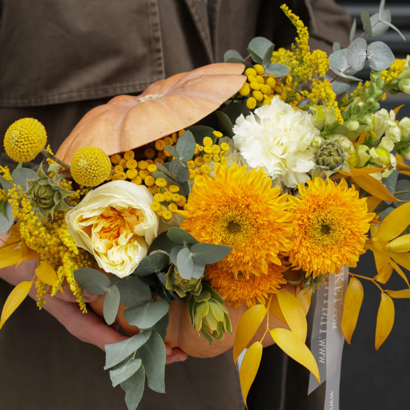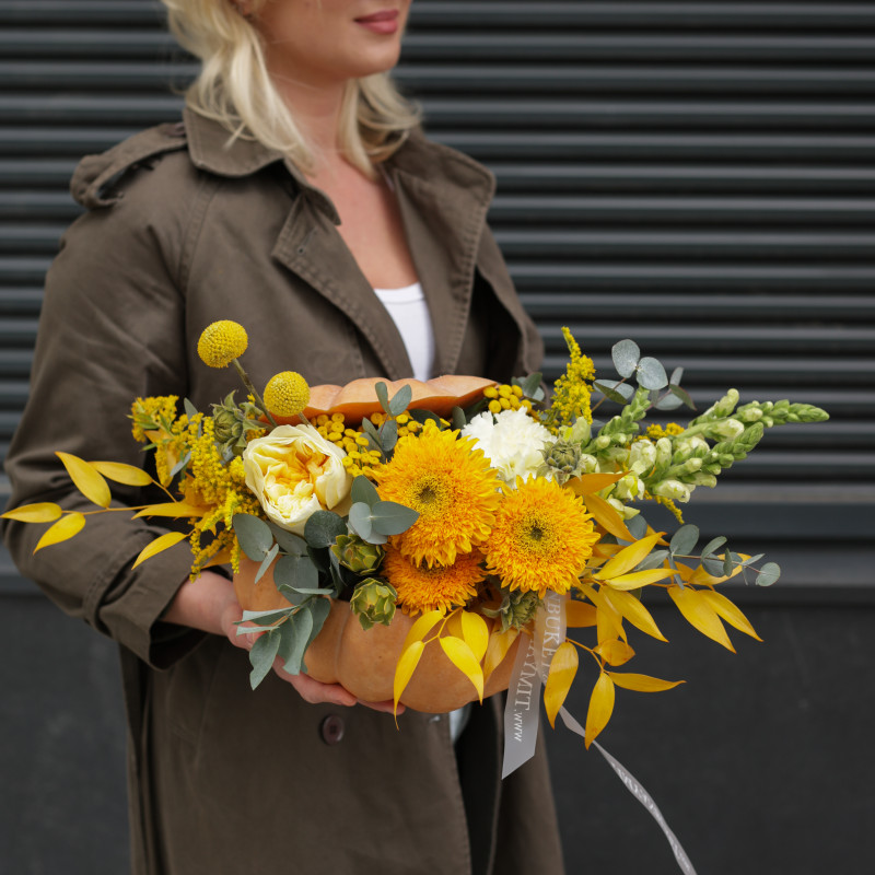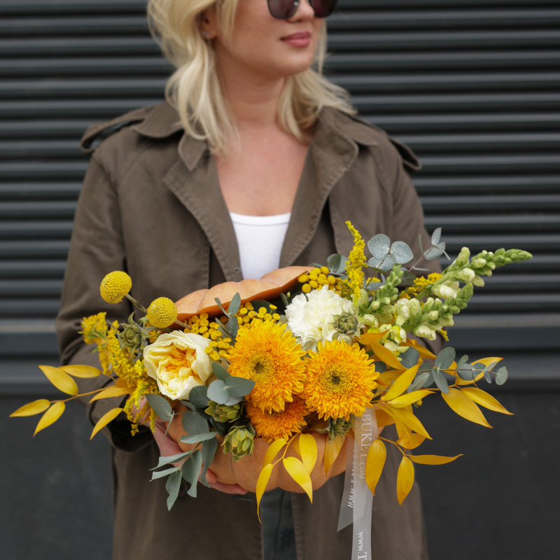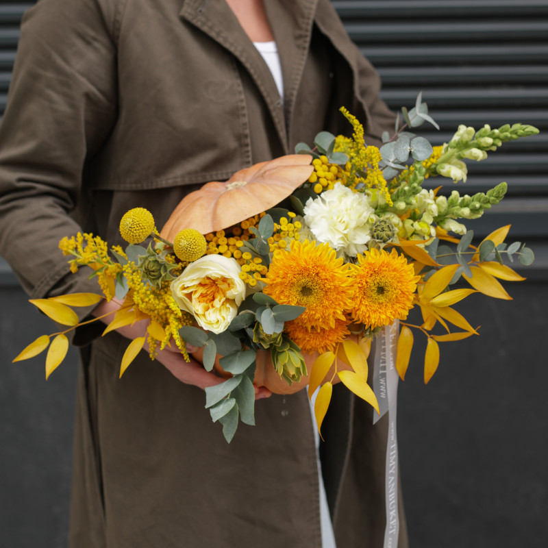 Ярко-жёлтая осенняя композиция в настоящей тыкве