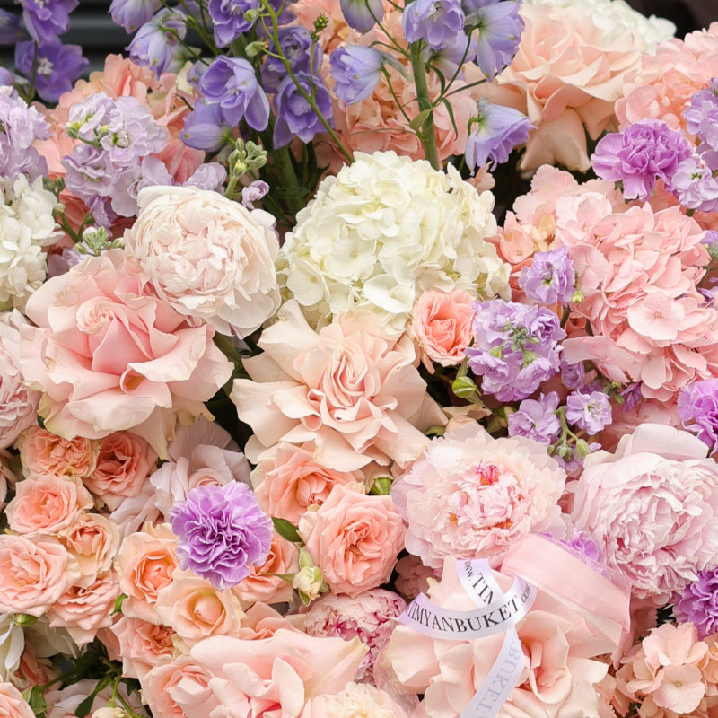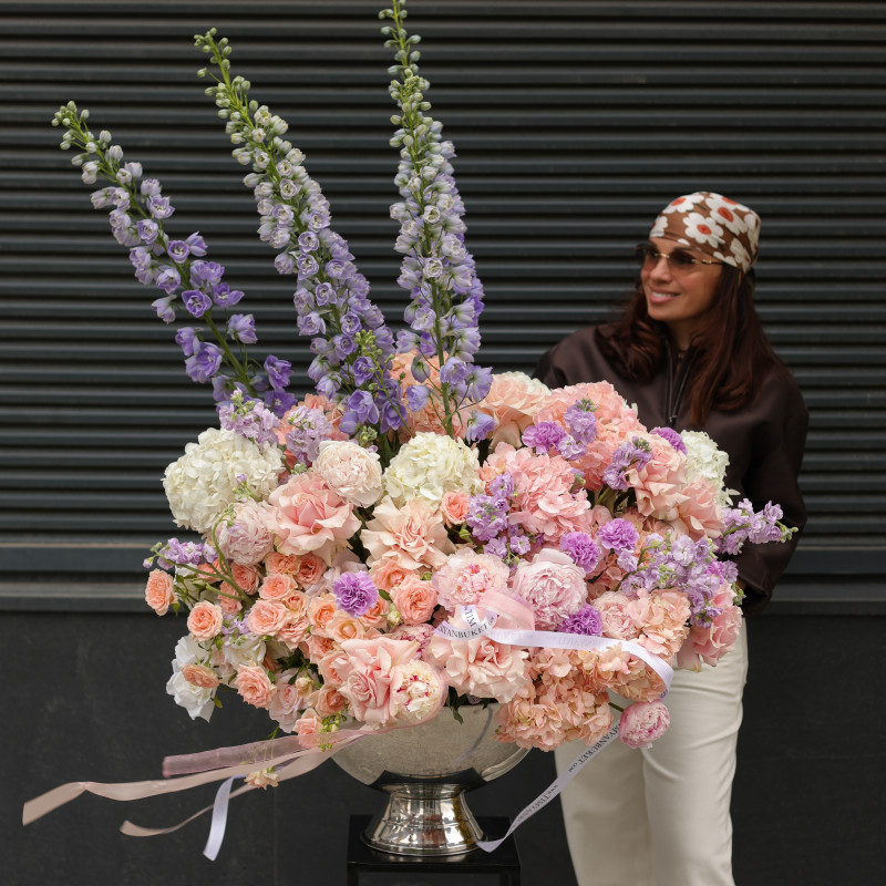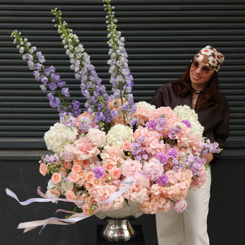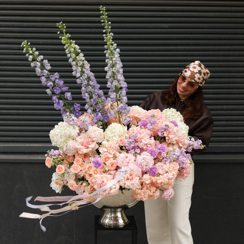 Композиция в вазе-шампаннице с гортензией и дельфиниумом — утончённая, воздушная и выразительная. Гортензия создаёт пышный объём и мягкую основу, дельфиниум добавляет глубину и вертикальный акцент, кустовые пионовидные розы привносят романтичность, маттиола — лёгкий аромат, а лавандовый диантус становится акцентной деталью, придавая композиции характер и изысканность. Идеальна как стильное украшение интерьера или эффектный подарок.