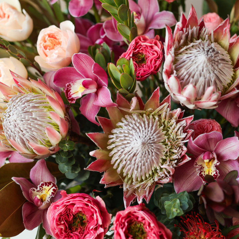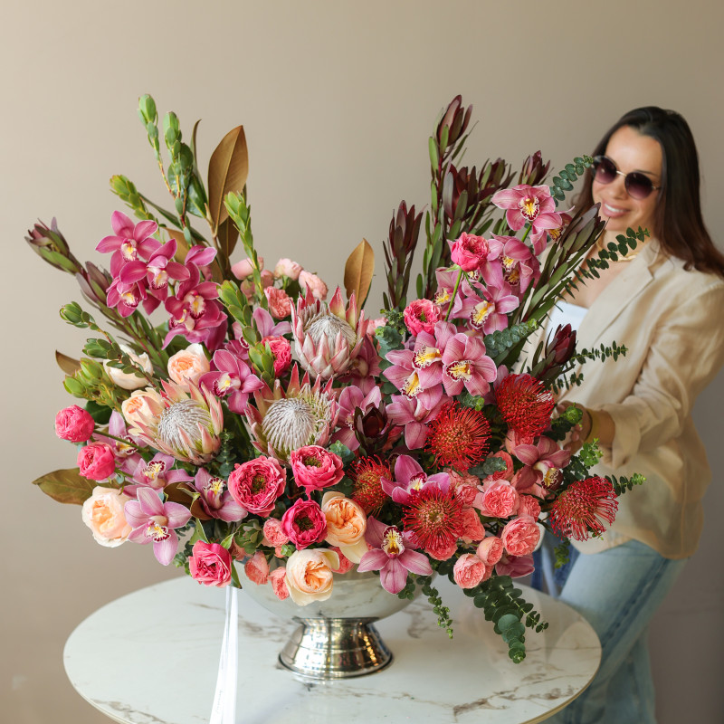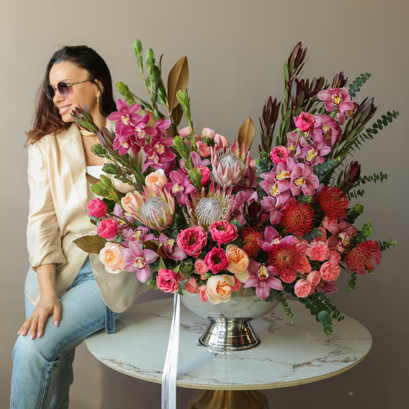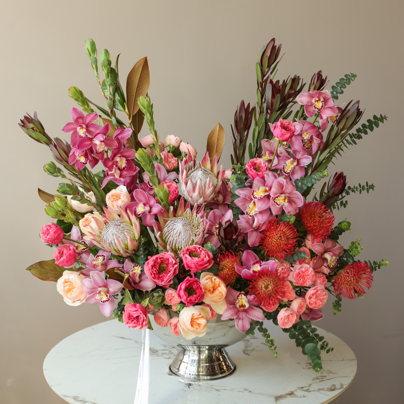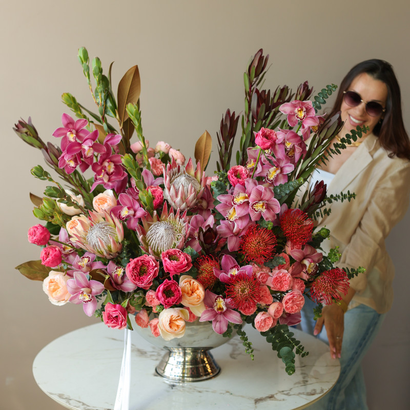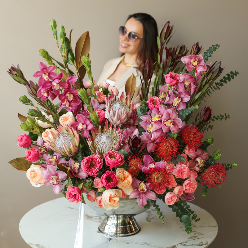 Премиум-композиция в трендовой вазе-шампаннице серебряного цвета — выразительная, современная и эффектная. Пудровые орхидеи создают мягкий утончённый акцент, пионовидные розы «Джульетта» и микс пионовидных роз добавляют объём и романтичность, а протея и леукоспермум привносят характер, фактуру и экзотическую графичность. Декоративная зелень объединяет композицию, создавая баланс и завершённость. Идеальна для вау-подарка или как стильный акцент в интерьере.