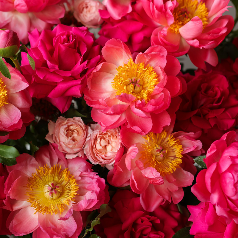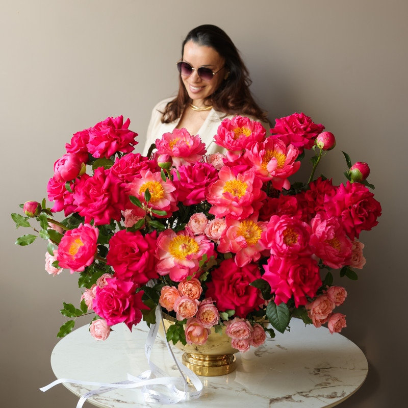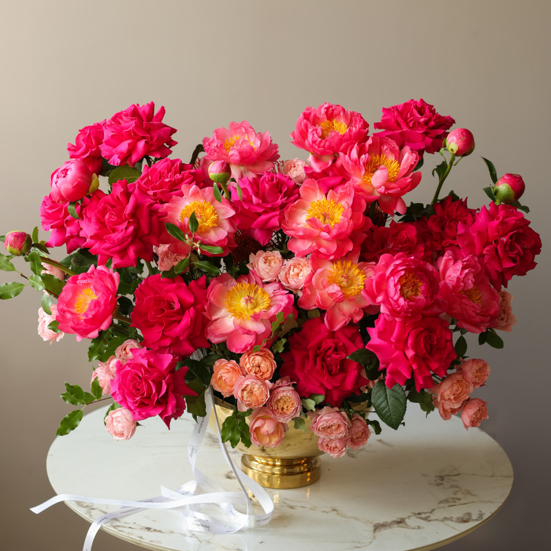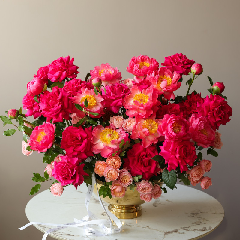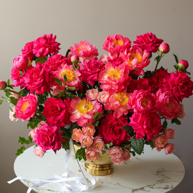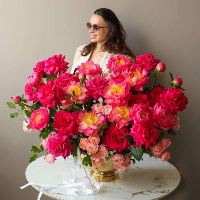 Премиум-композиция в трендовой вазе-шампаннице золотого цвета — яркая, живая и по-настоящему эффектная. Коралловые пионы, меняющие оттенок в процессе раскрытия, создают динамику и глубину, малиновые французские розы добавляют насыщенность и выразительность, кустовая пионовидная роза привносит пышность и мягкость, а декоративная зелень балансирует композицию и подчёркивает её природную эстетику. Идеальна для вау-подарка, особого повода или как роскошный акцент в интерьере.