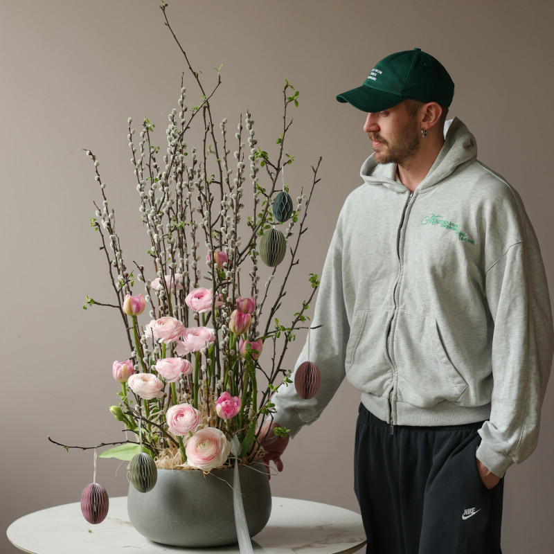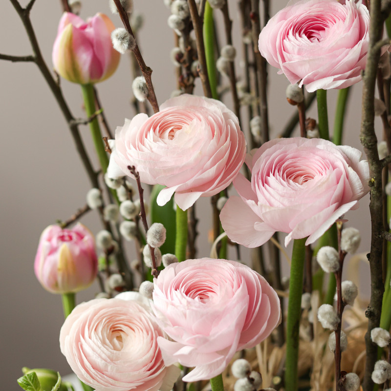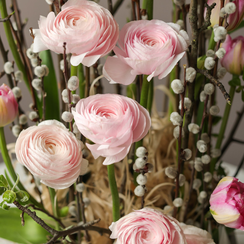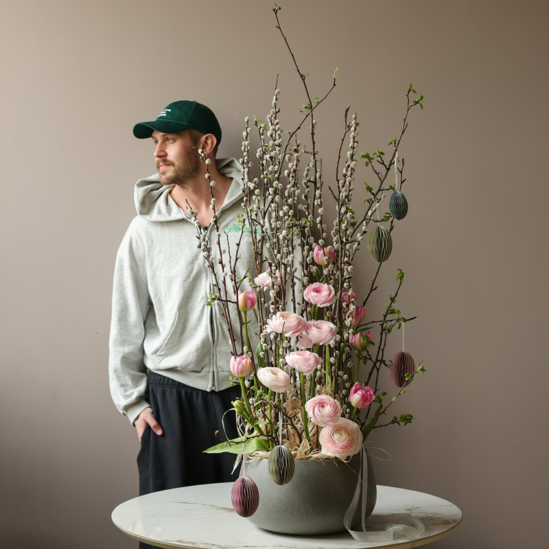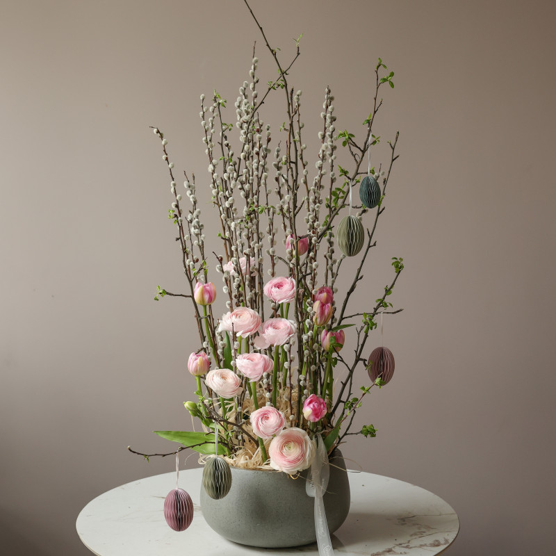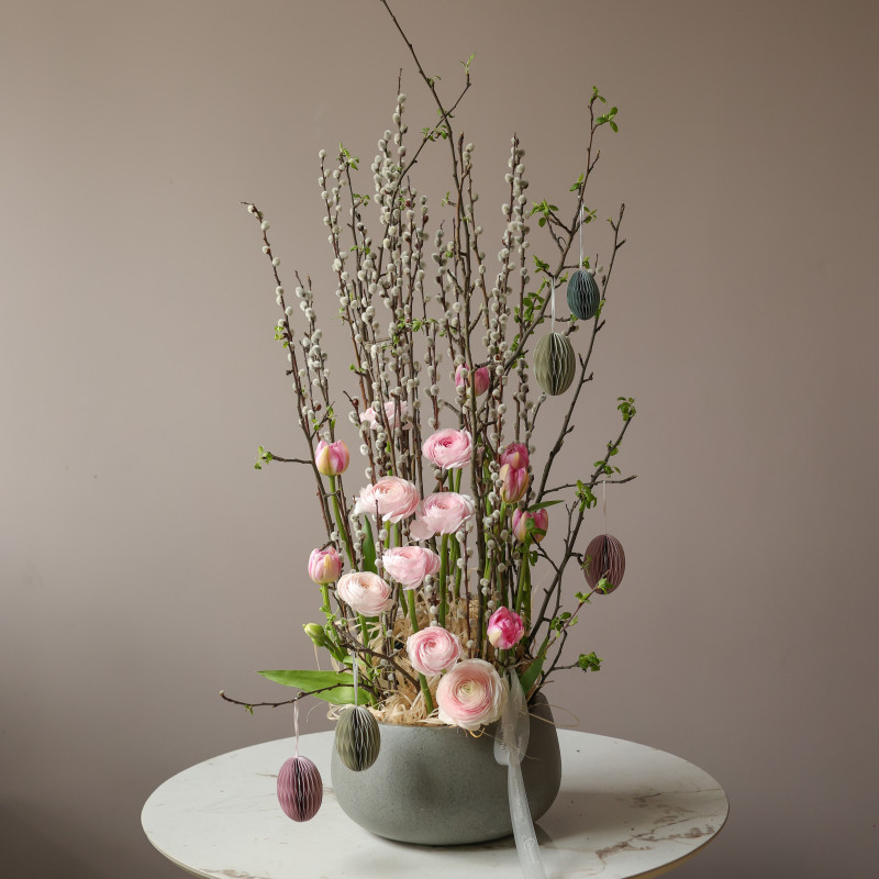 Пасхальная композиция с вербой, ранункулюсами и декоративными яйцами