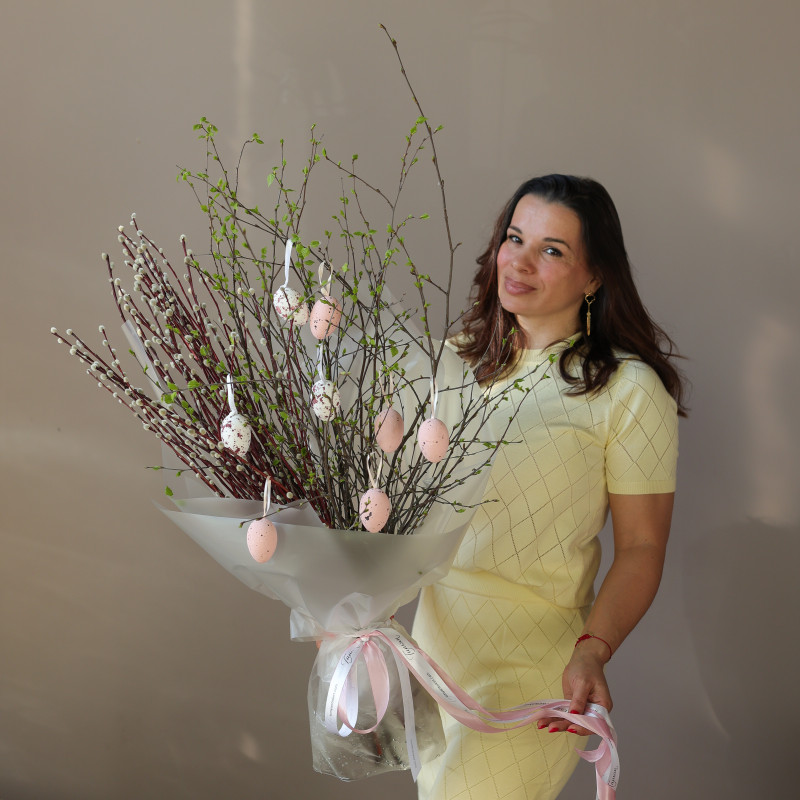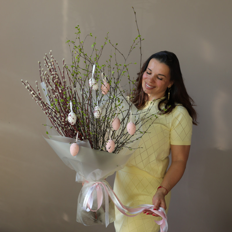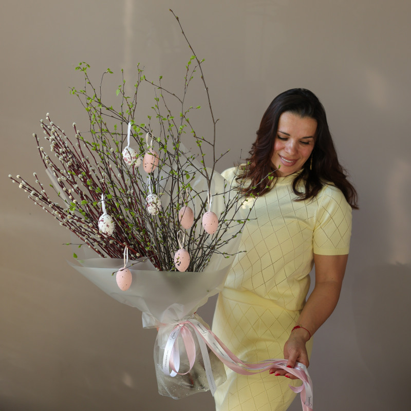 Пасхальный букет с веточками вербы и молодой липы — лёгкий, символичный и по-настоящему весенний. Пушистая верба создаёт атмосферу праздника, веточки липы с нежными листочками добавляют свежесть и живую природную эстетику. Декоративные пасхальные яйца на ленточках придают композиции игривый акцент, а полупрозрачная упаковка с длинными лентами подчёркивает её воздушность и деликатность. Идеален как пасхальный подарок или стильное украшение дома.