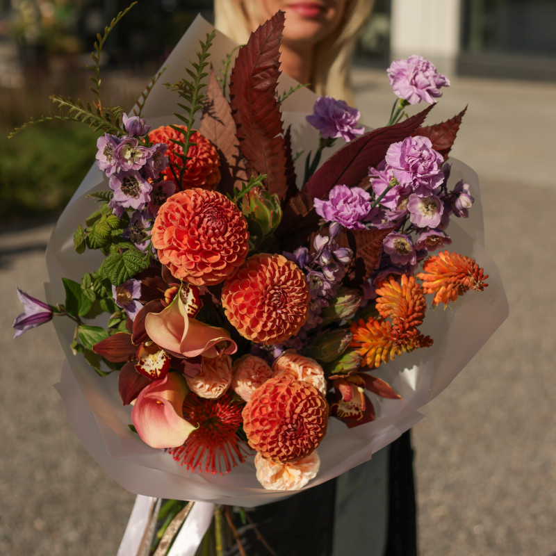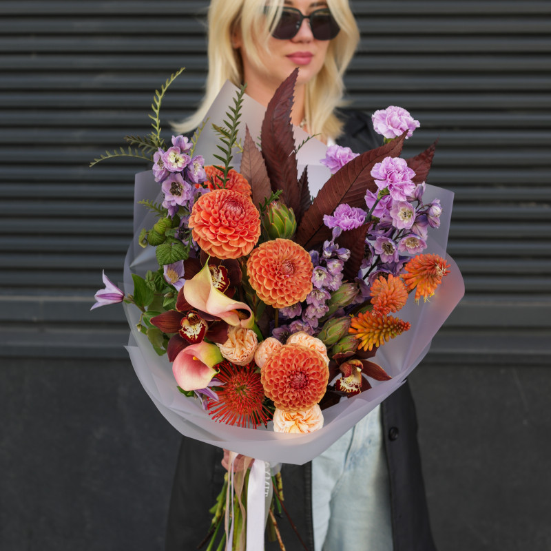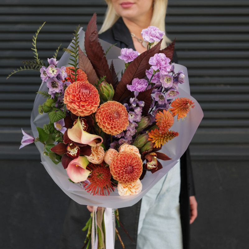 арт. 6064Яркий букет с апельсиновыми георгинами и коричневой орхидеей — необычная, теплая композиция с легким экзотическим акцентом. Сочные георгины цвета спелого апельсина создают солнечную основу, лавандовый диантус добавляет нежный контраст, а коричневые орхидеи придают глубину и бархатистость. Яркий рамбутан вносит элемент тропической свежести, декоративная зелень завершает образ, подчеркивая природную фактуру.