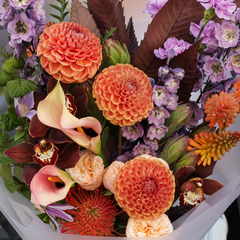 Состав: апельсиновые георгины, лавандовый диантус, коричневые орхидеи, рамбутан, декоративная зелень.