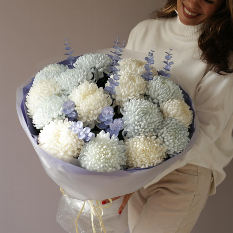 Нежное облако белых и голубых хризантем – очаровательный и вдохновляющий букет.