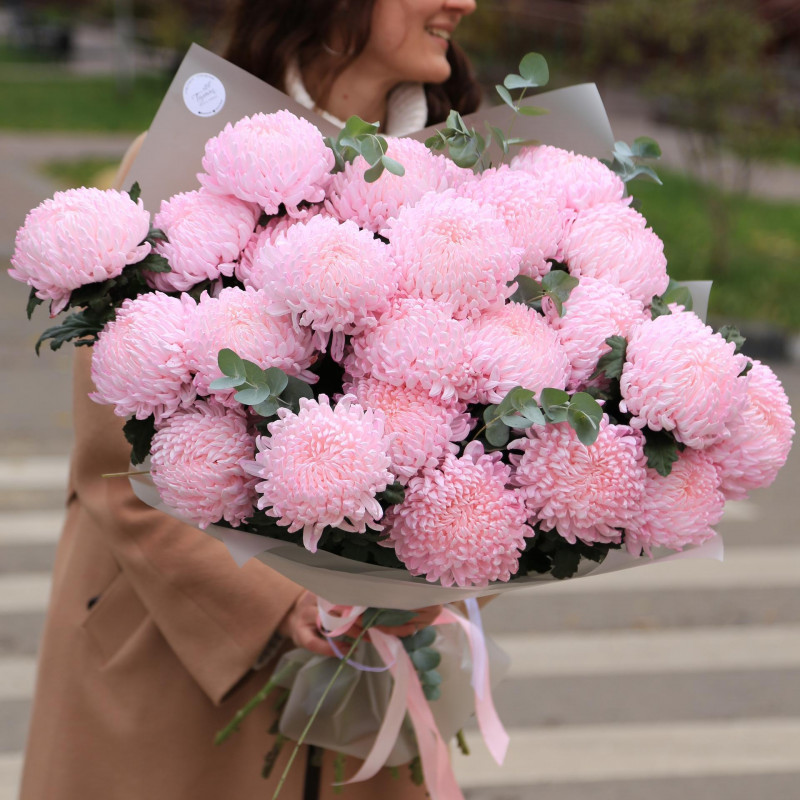 Букет из розовых хризантем с эвкалиптом! Объемный, нежный и безумно красивый.