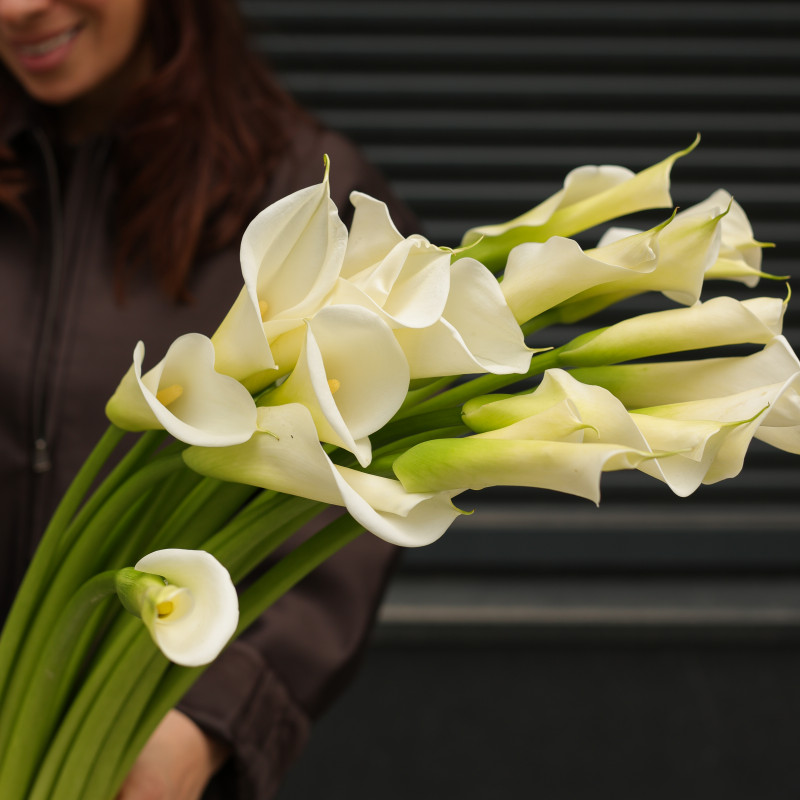 Монобукет высоких белых калл — строгий, элегантный и выразительный. Изящные вытянутые линии калл создают графичную композицию, а чистый белый оттенок подчёркивает утончённость и статусность букета. 19 стеблей формируют эффектный объём, сохраняя лёгкость и минимализм. Белая лента аккуратно завершает образ, делая букет стильным и завершённым. Идеален для торжественного повода, делового подарка или как элегантный знак внимания.