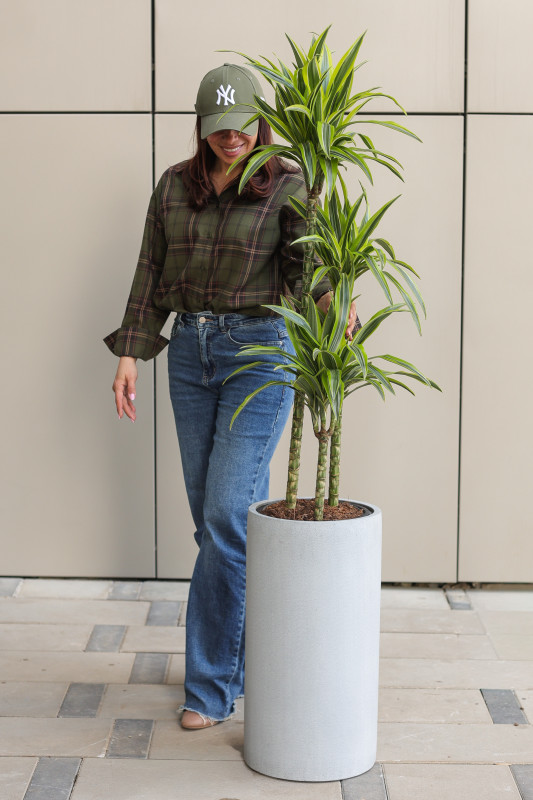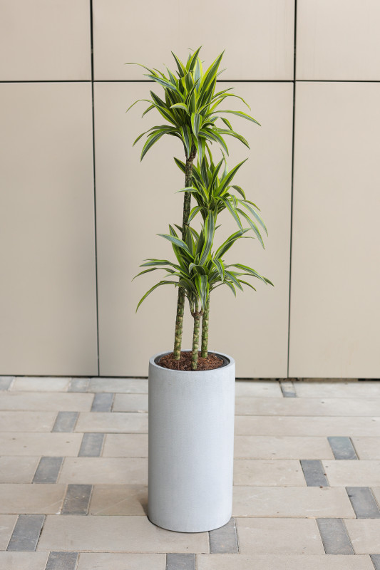 Высокая драцена в дизайнерском кашпо-цилиндре