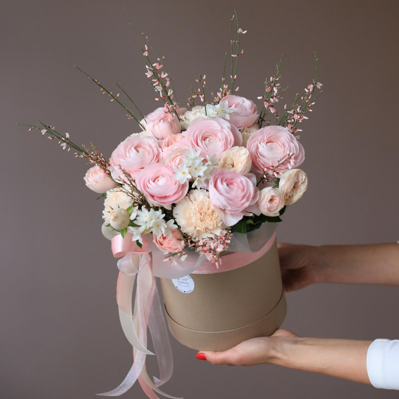 Нежная весенняя композиция в шляпной пудровой коробке с ранункулюсами и пионовидными розами.