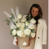 Стильная и утонченная композиция с белыми розами в коробке для особого случая. Нежные белые розы символизируют чистоту и элегантность, а эвкалипт добавляет свежесть и легкий аромат. Изюминкой композиции являются белоснежные перья, создающие воздушный и изысканный акцент.