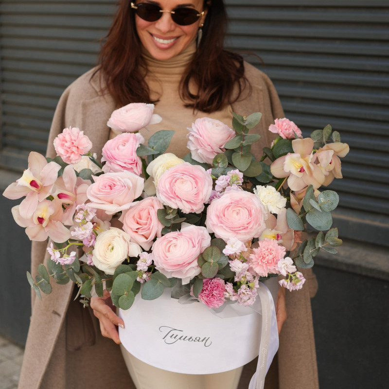Коробка с ранункулюсами, пионовидными розами и орхидеей