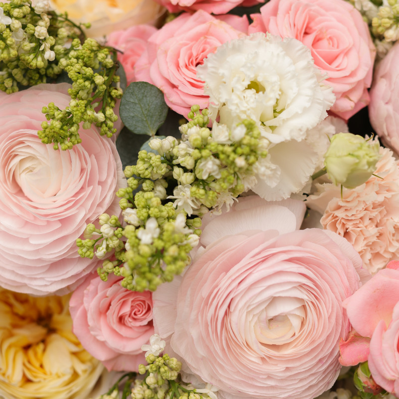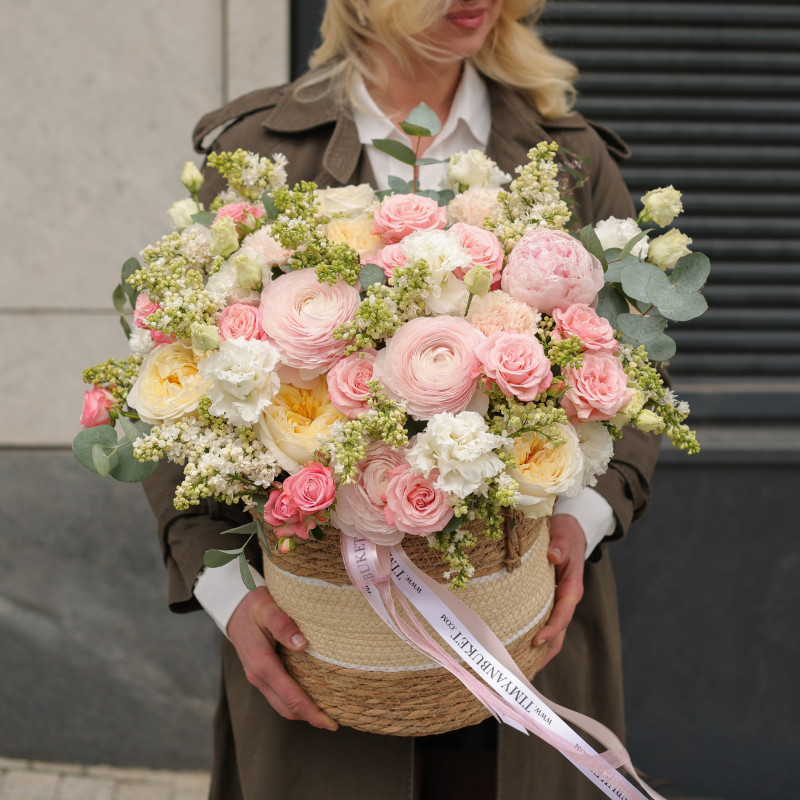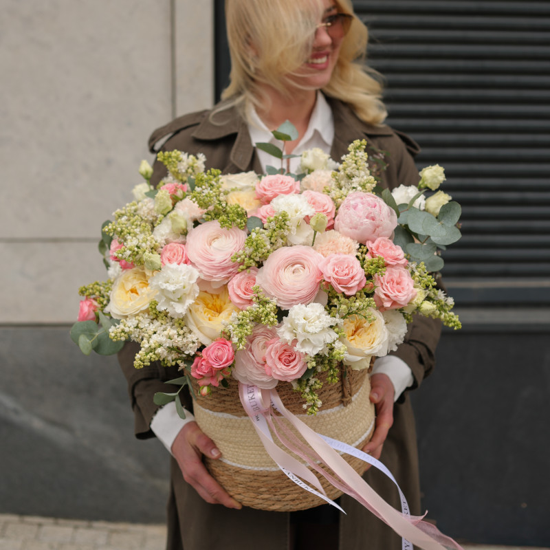 Коробка с сиренью, ранункулюсами и пионовидными розами