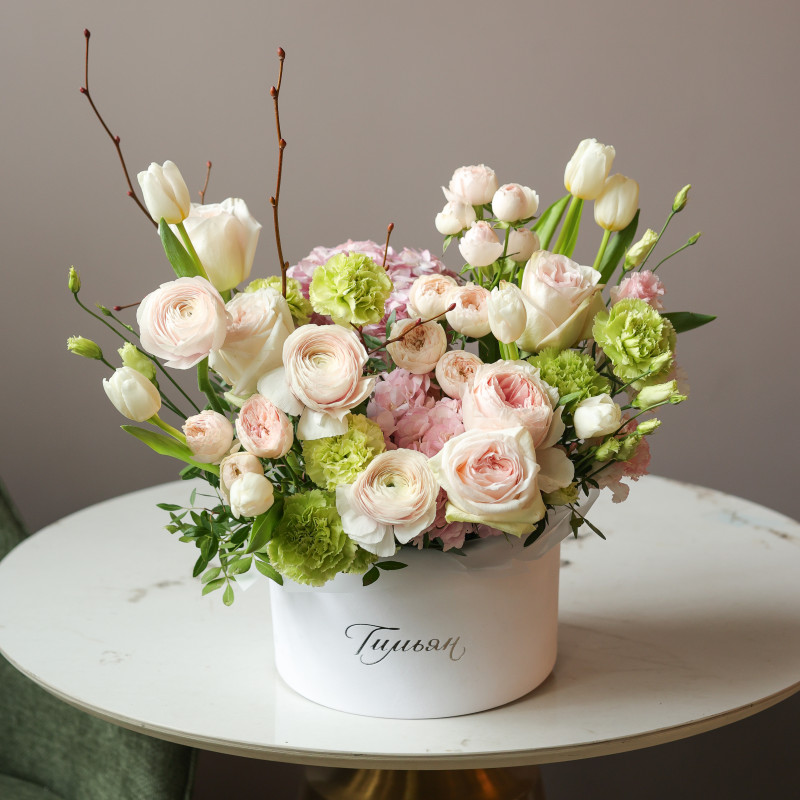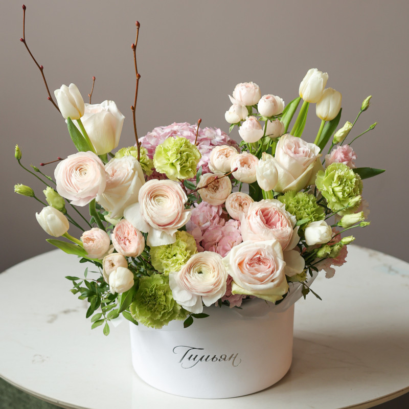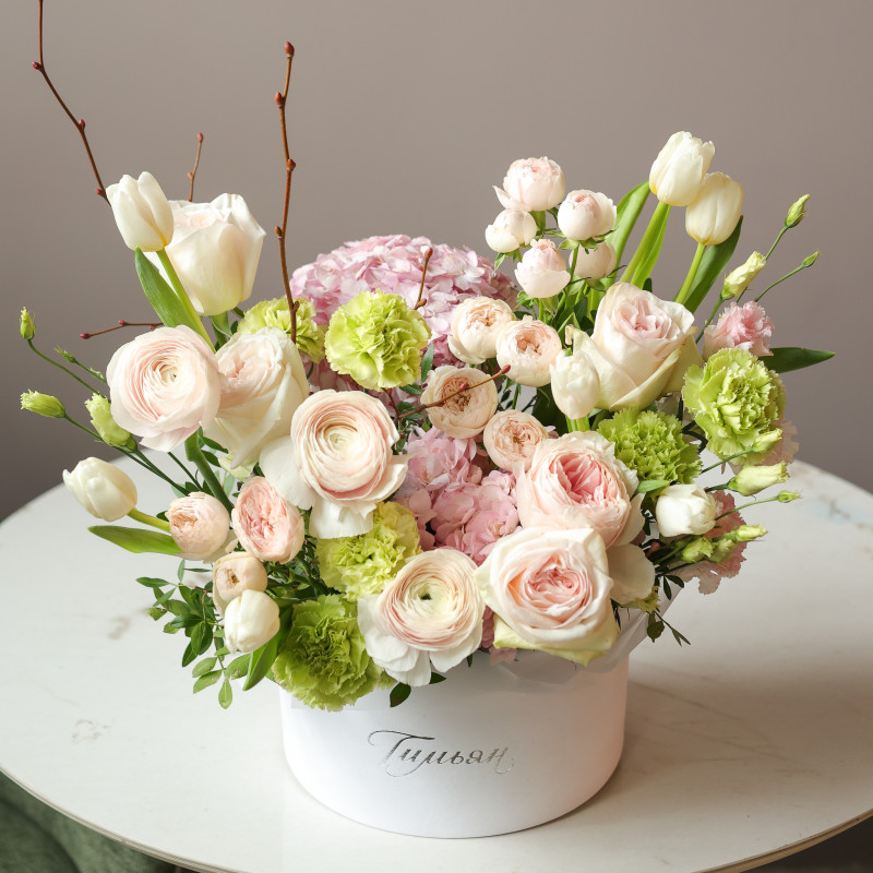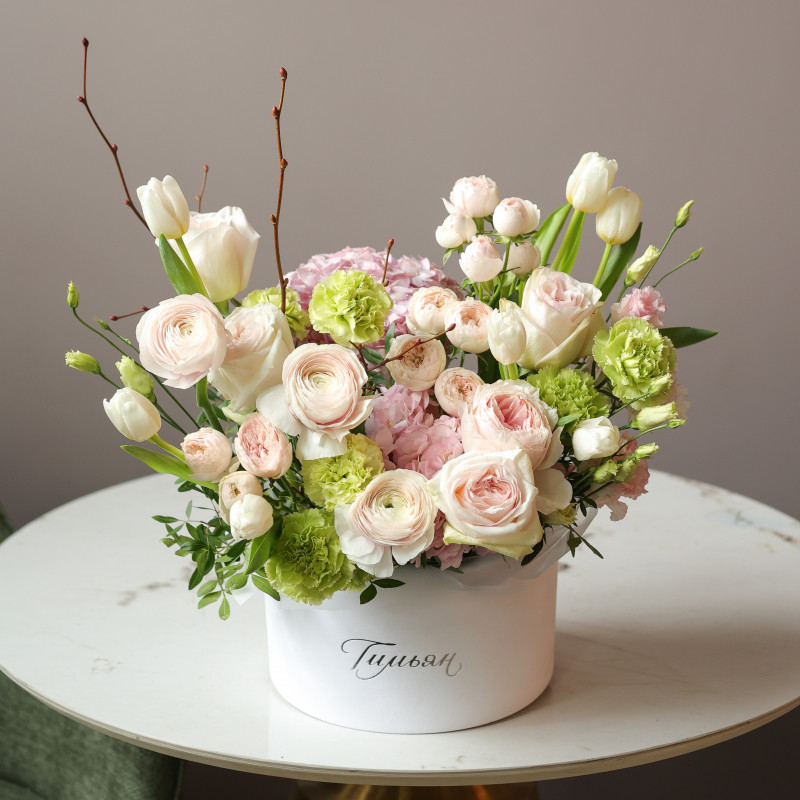 Нежная коробка с ранункулюсами, пионовидными розами и тюльпанами