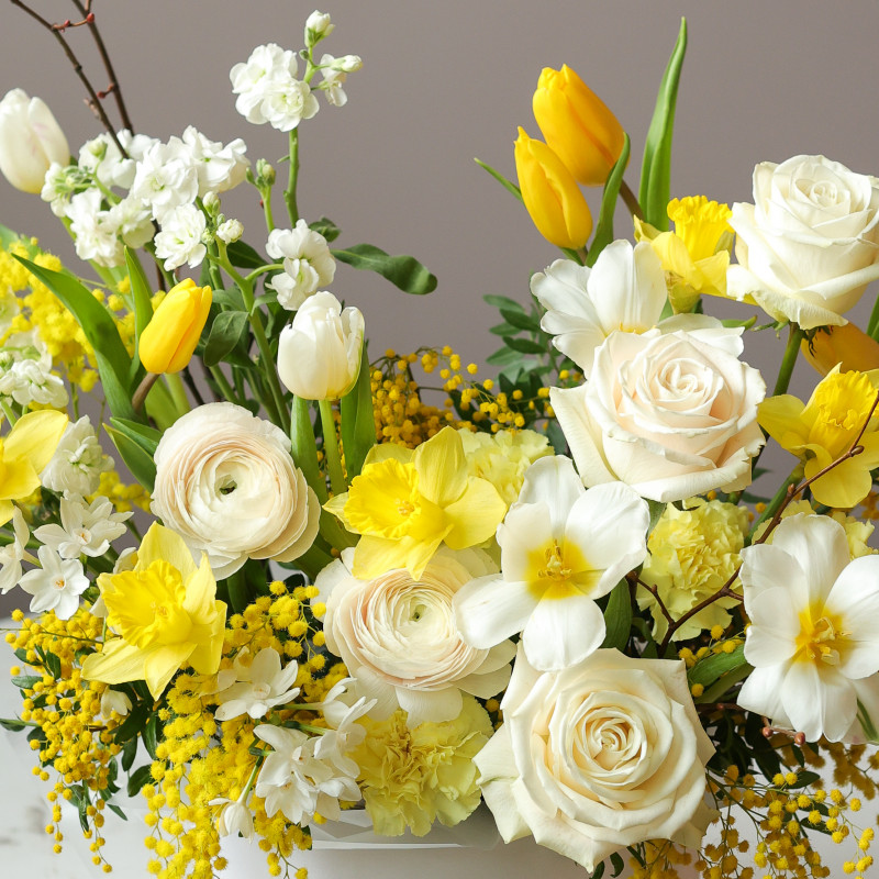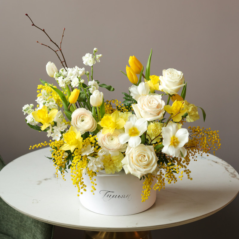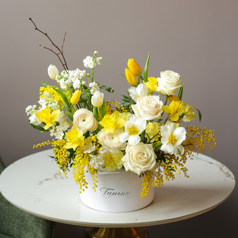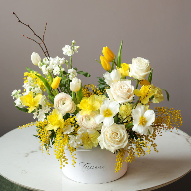 Солнечная коробка с ранункулюсами, нарциссами и мимозой