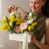 Состав: ранункулюс, белые тюльпаны, желтые нарциссы, мимоза, маттиола, декор. зелень
