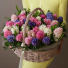 Ароматная композиция разноцветных гиацинтов в плетеной круглой корзинке.