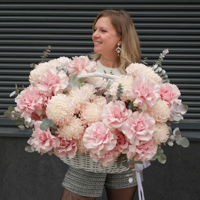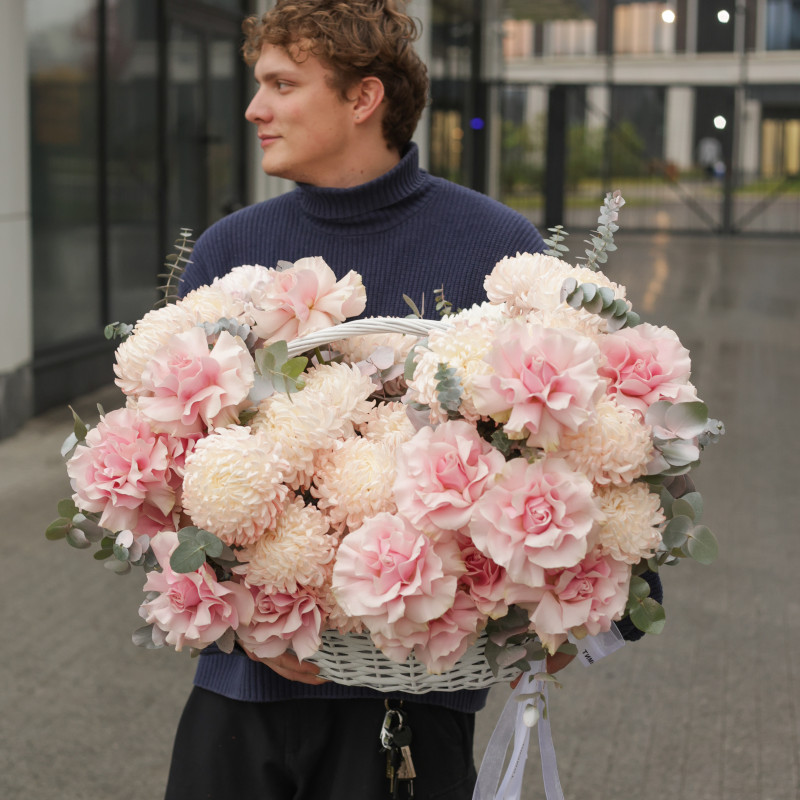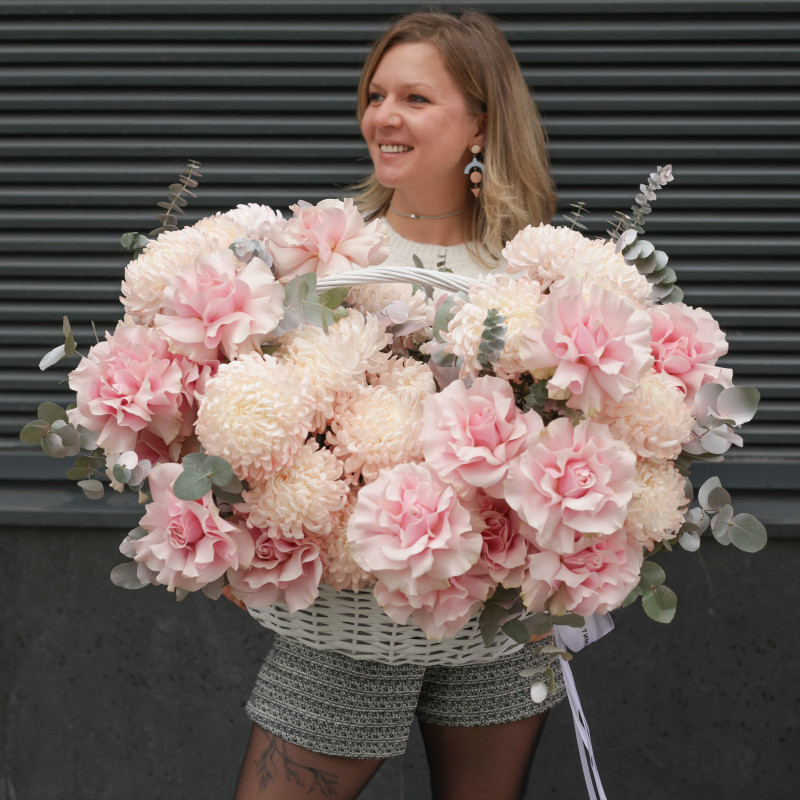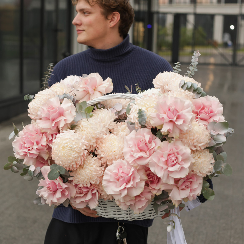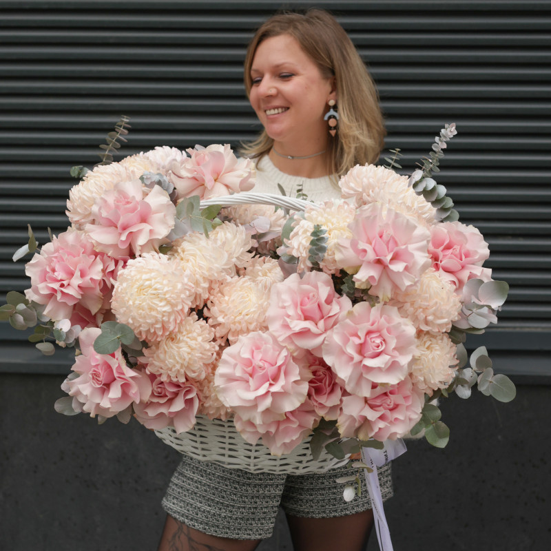 Воздушная композиция в плетеной белой корзине с розовыми французскими розами и пудровыми хризантемами — нежная и романтичная композиция в мягкой пастельной палитре. Розовые розы создают утонченную основу, пудровые хризантемы добавляют объем и легкость, а эвкалипт придает свежести и завершает гармоничный образ букета, делая его элегантным и изысканным.