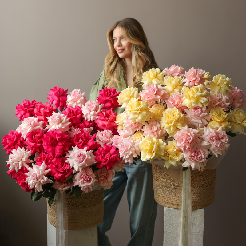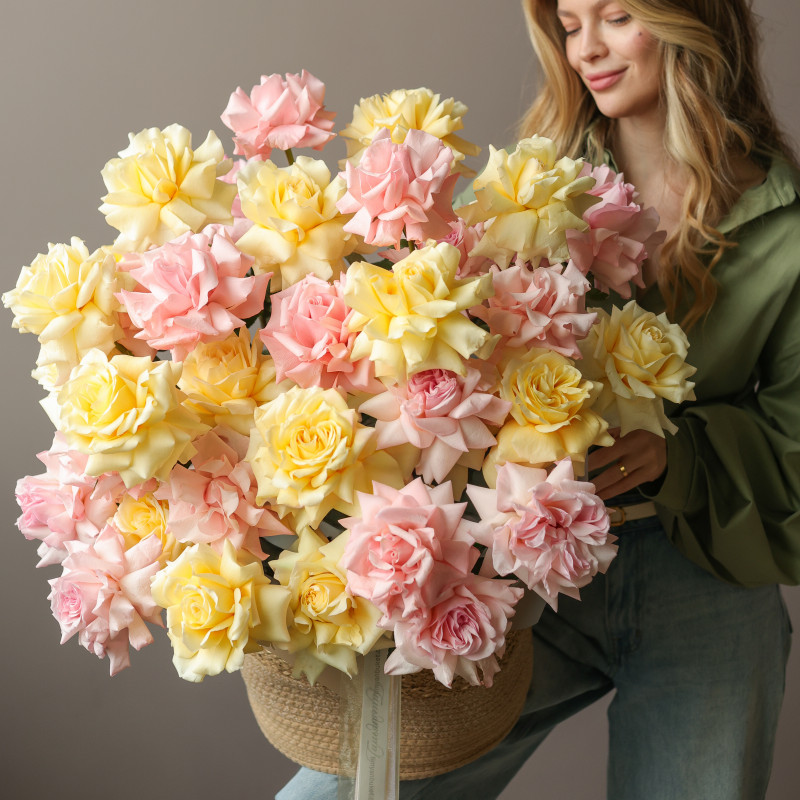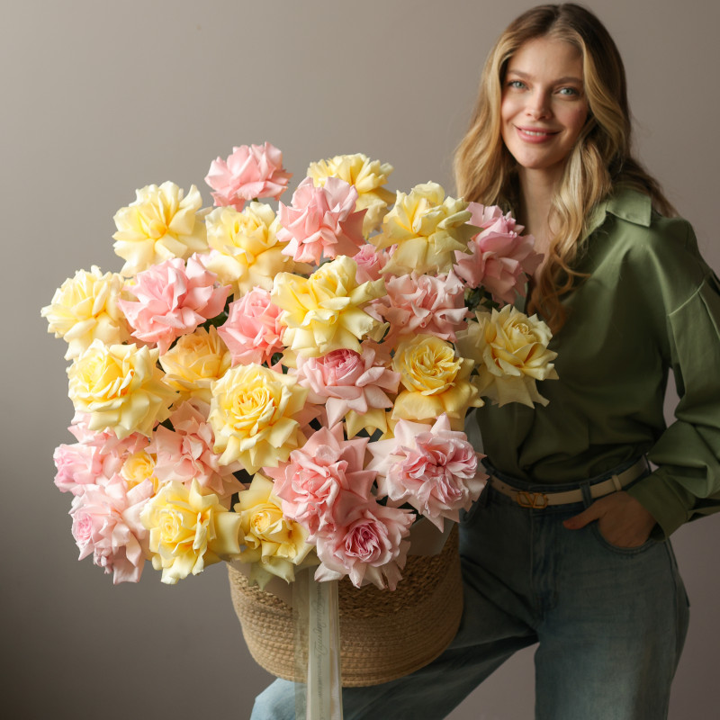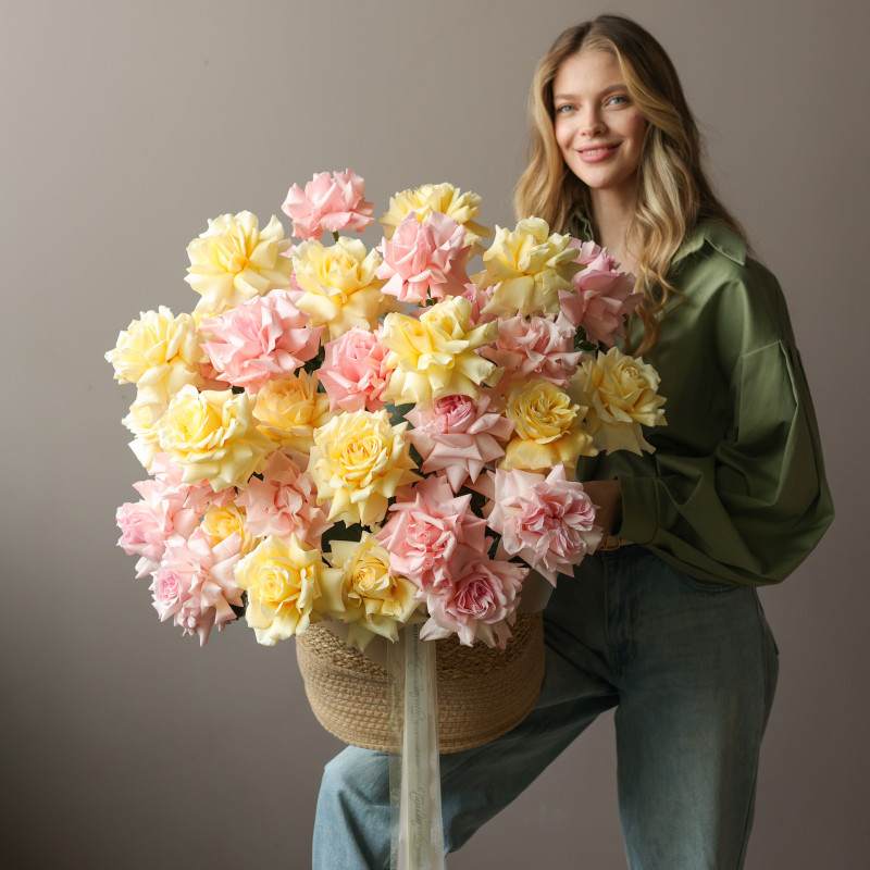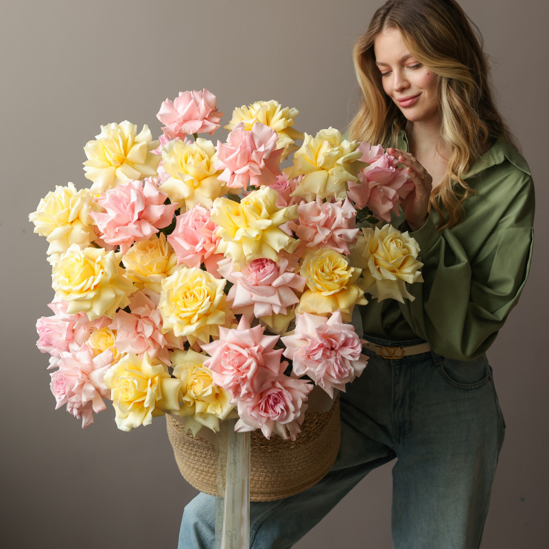 Корзина вау с французскими желтыми и розовыми розами XL 70 см