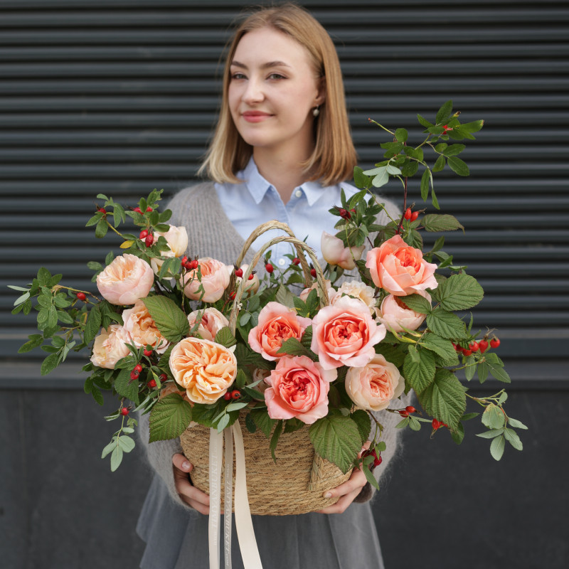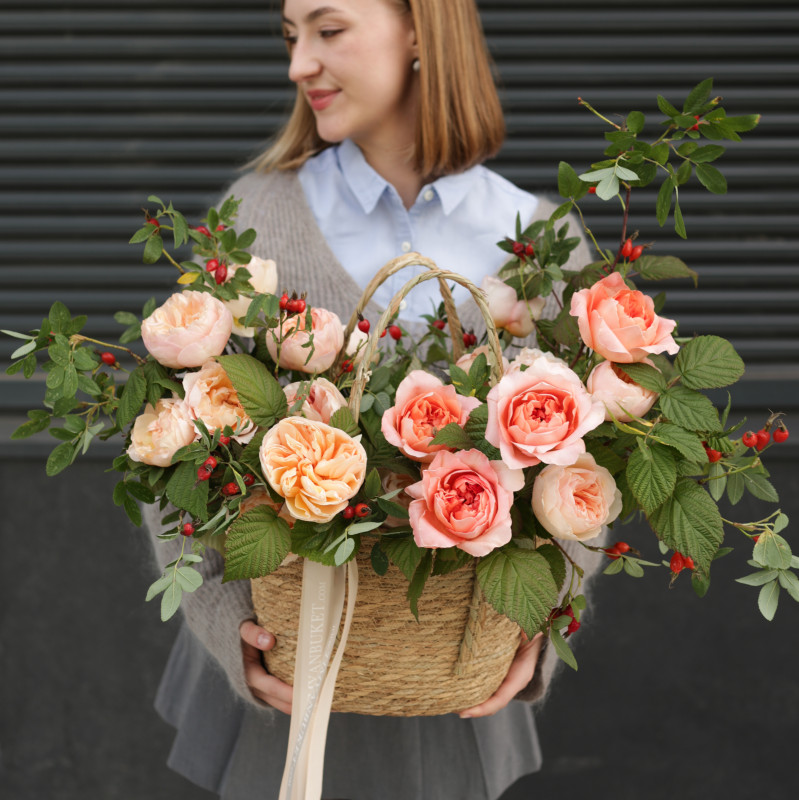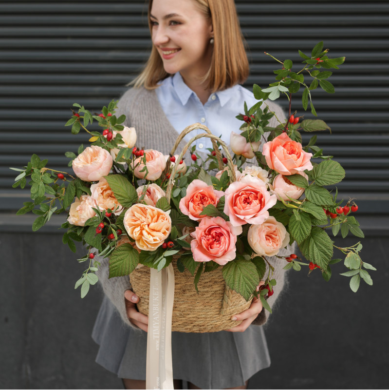 арт. 6099Композиция в джутовой корзине с ручками, собранная в тёплой, уютной палитре. Нежные пионовидные персиковые розы гармонично сочетаются с живыми веточками малины и яркими ягодками шиповника, создавая атмосферу уюта и лёгкой осени. Такой подарок подчеркнёт внимание и заботу, станет душевным акцентом в интерьере и подойдёт как для искреннего признания, так и для тёплого семейного праздника.