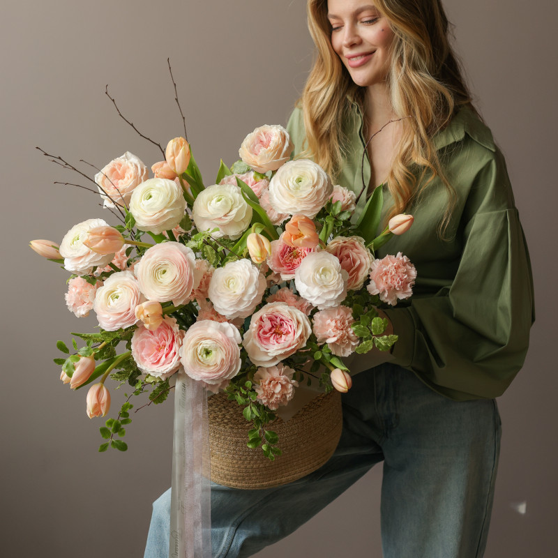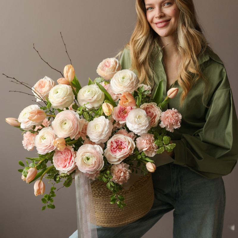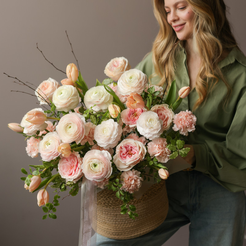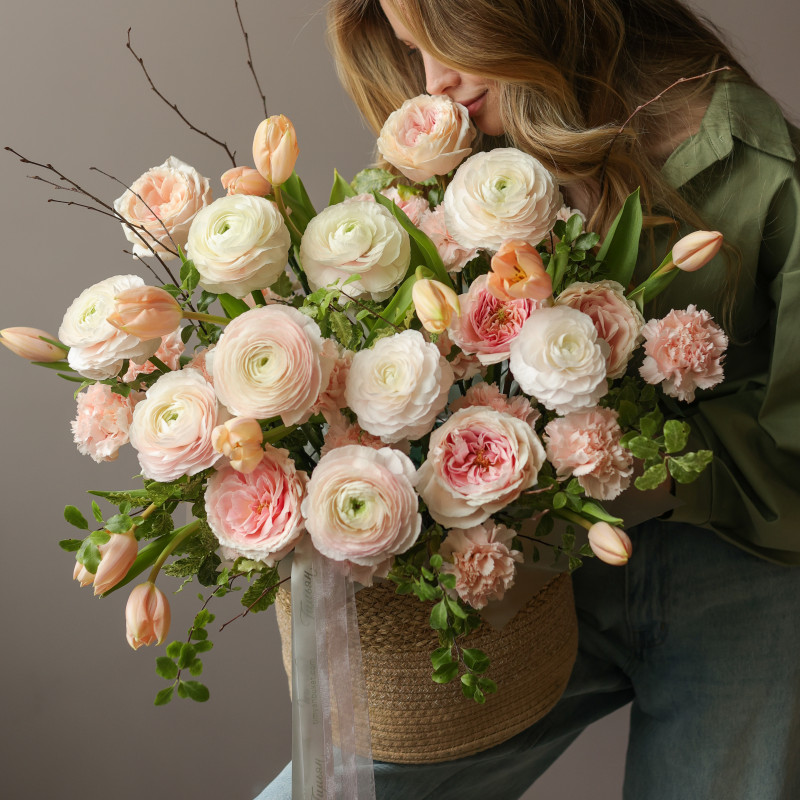 Корзина с ранункулюсами, пионовидными розами и тюльпанами