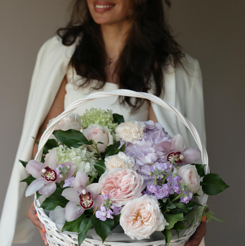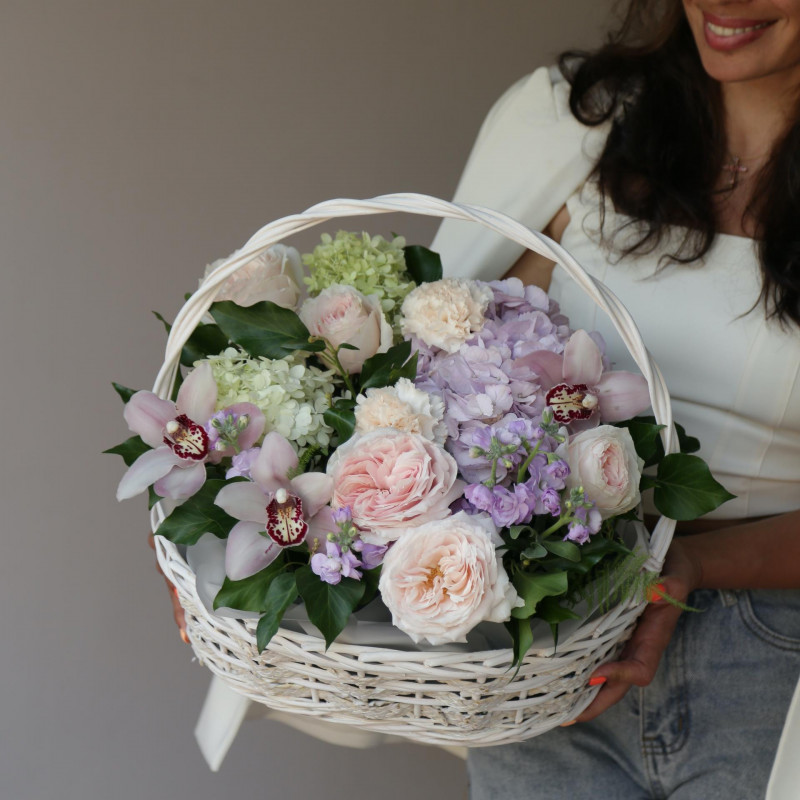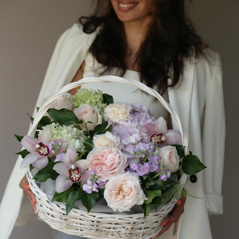 Композиция в плетеной корзинке с орхидеями, розами и гортензией.