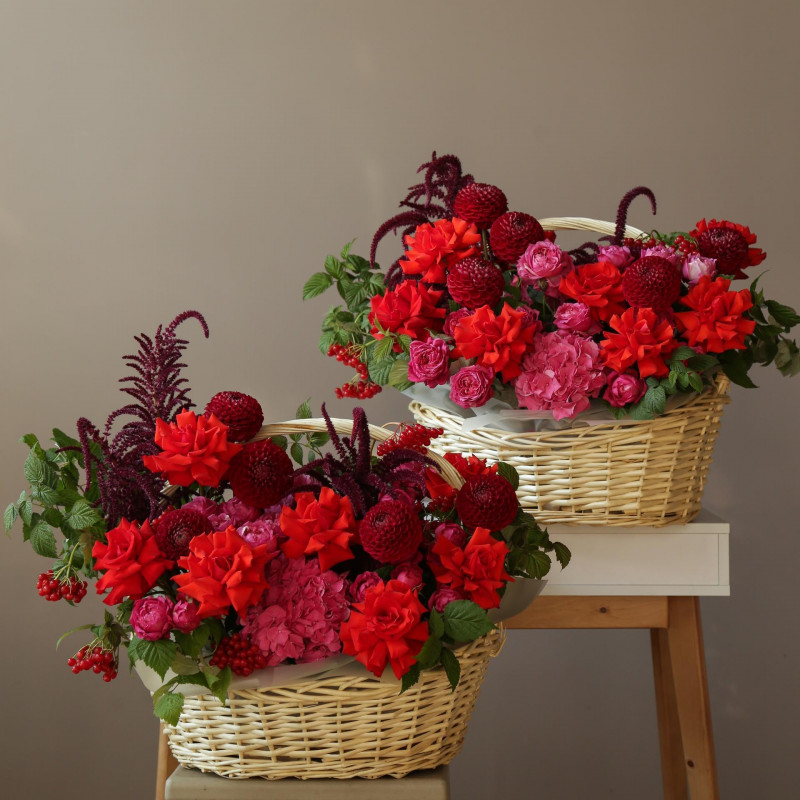 Яркая, прекрасная, сочная осенняя композиция в плетеной корзине с ягодами калины.