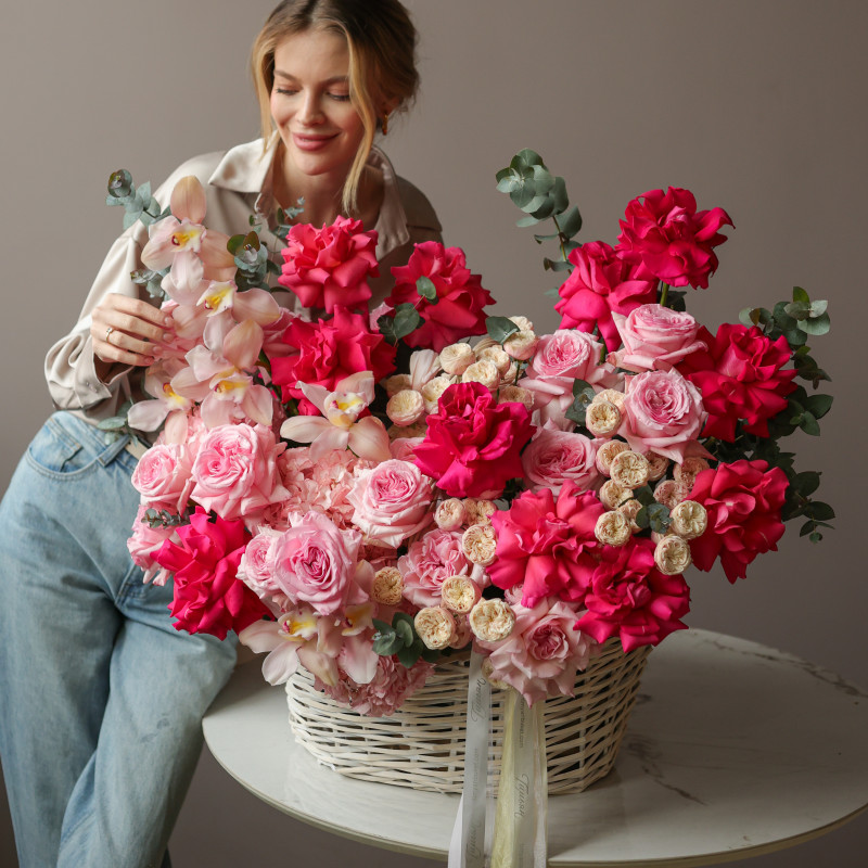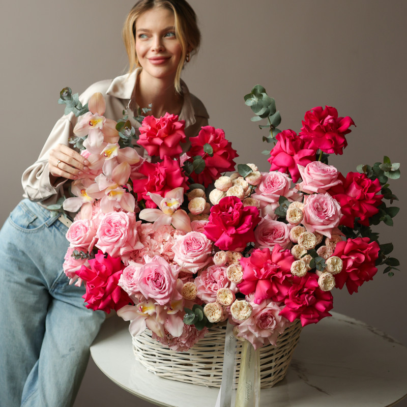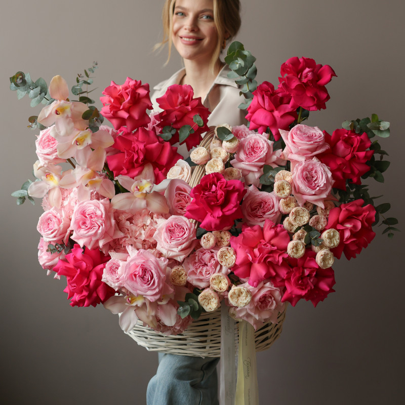 Премиум-корзина с малиновыми французскими розами и миксом роз XL 80-90 см