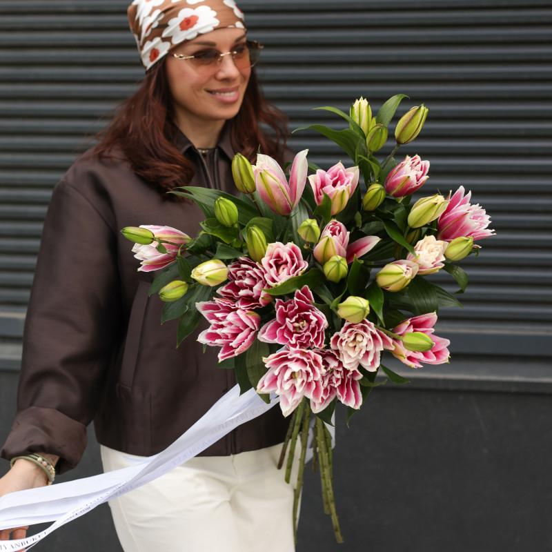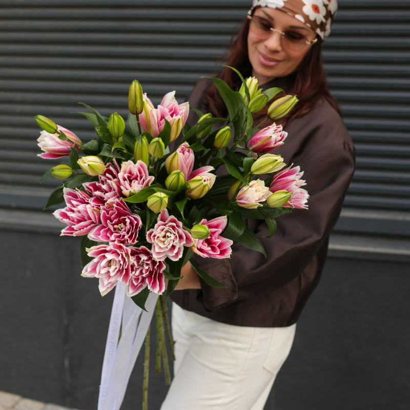Монобукет пионовидных лилий — выразительный, эффектный и по-настоящему роскошный. Малиновые лепестки с нежным белым градиентом создают яркий контраст и притягивают взгляд, а пионовидная форма придаёт цветам дополнительный объём и изысканность. Композиция выглядит стильно и самодостаточно, подчёркивая красоту каждого цветка. Идеален для эффектного подарка или как выразительный знак внимания.