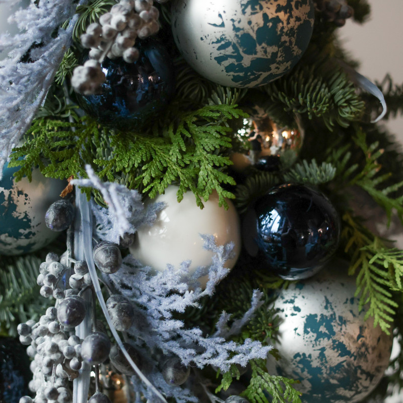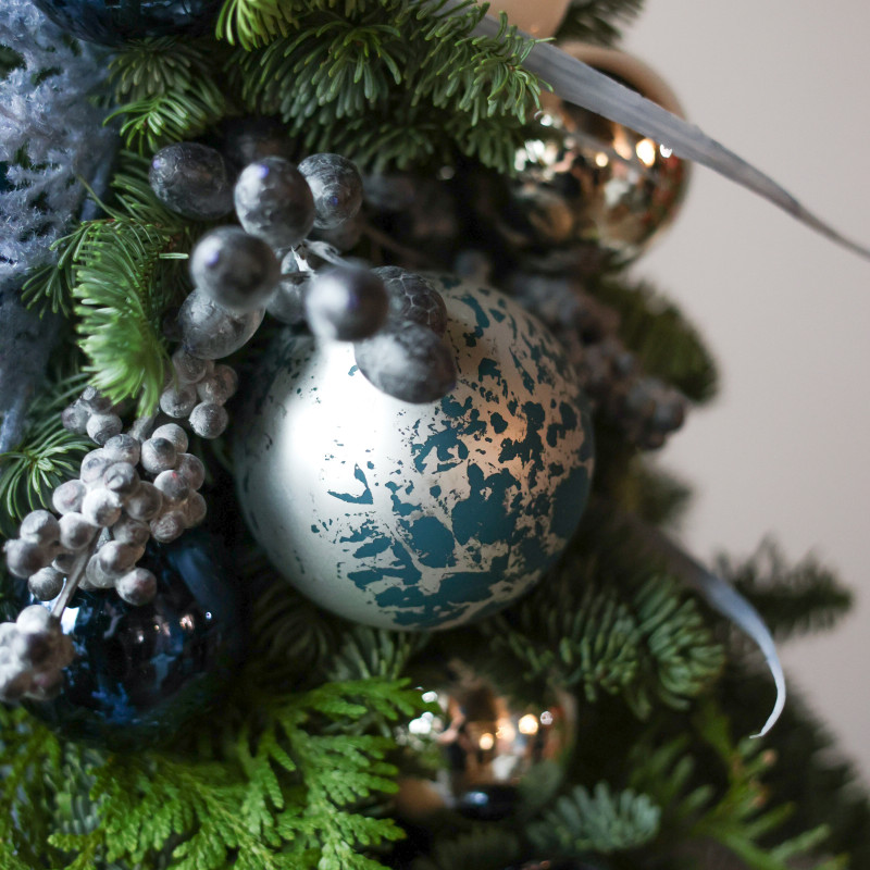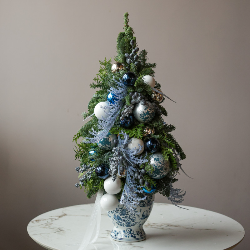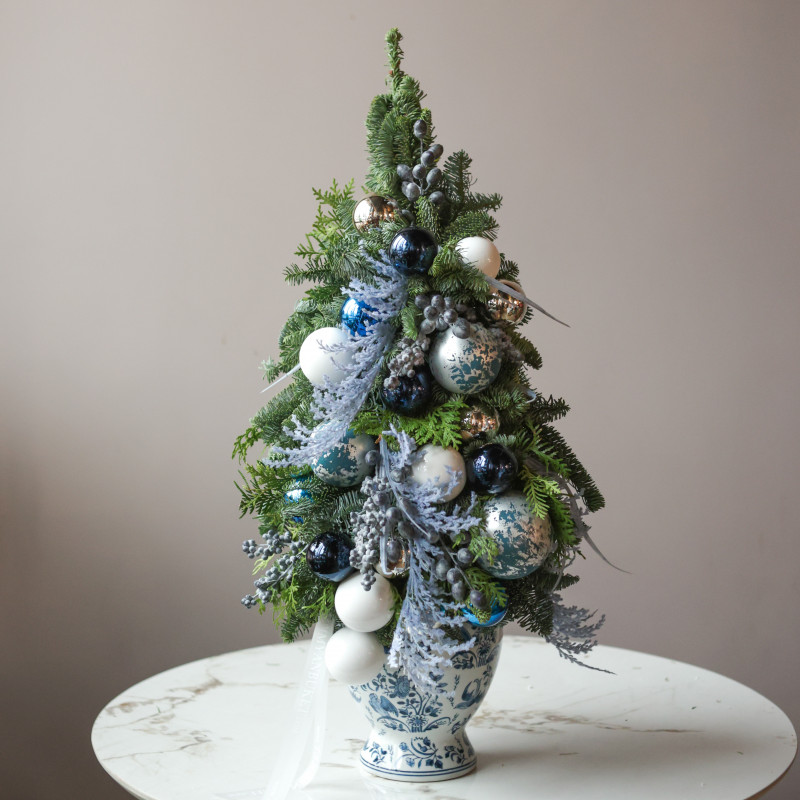 Авторская эксклюзивная елка из натуральной хвои — сочетание пихты и туи — оформлена в керамической вазе с голубой росписью. Свежая хвоя создаёт плотную фактуру и насыщенный аромат, а продуманный голубо-серебристый декор делает композицию стильной и гармоничной.