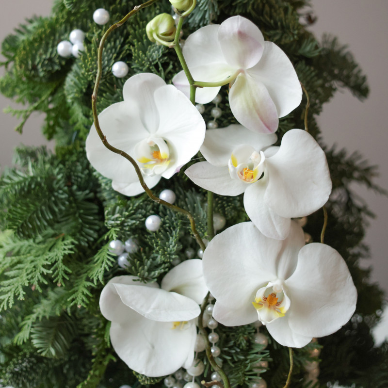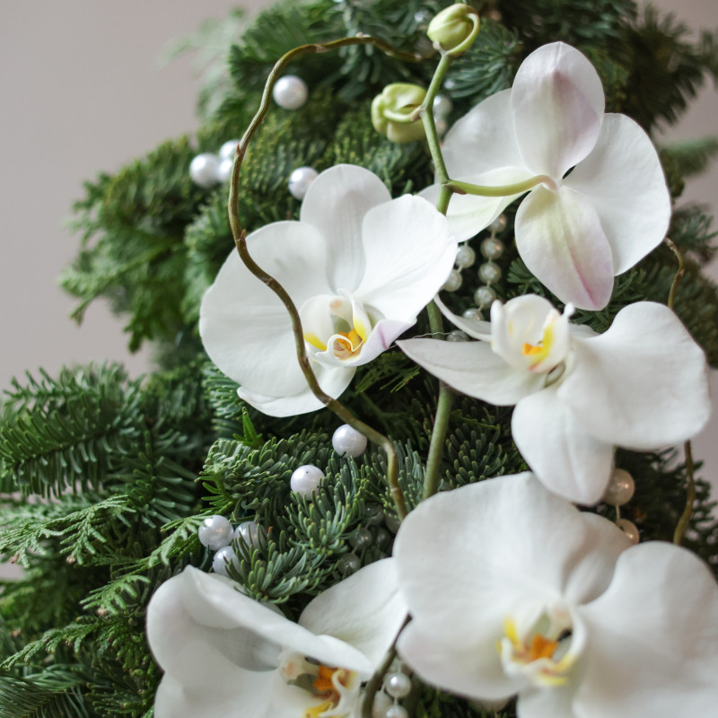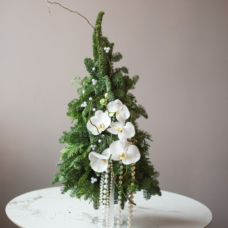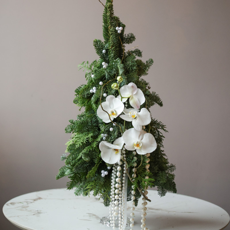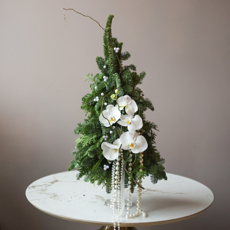 Невероятная авторская елочка ручной работы из живой хвои с уникальным декором из настоящих орхидей и жемчужных бус разного диаметра. Композиция выполнена на изящной стеклянной «парящей» подставке, создавая ощущение лёгкости и воздушности, идеально вписывается в современный интерьер и акцентирует праздничную атмосферу.