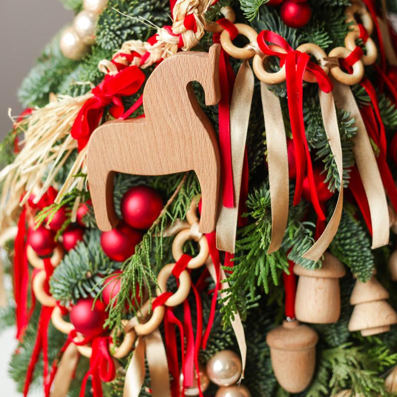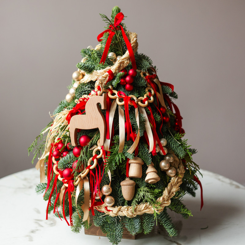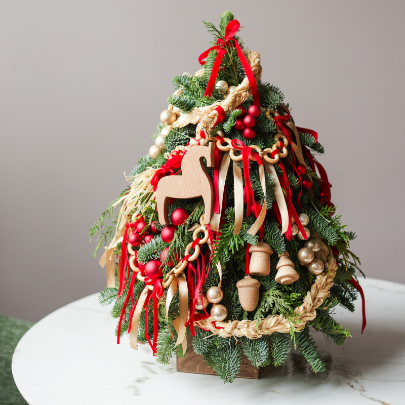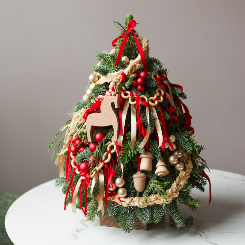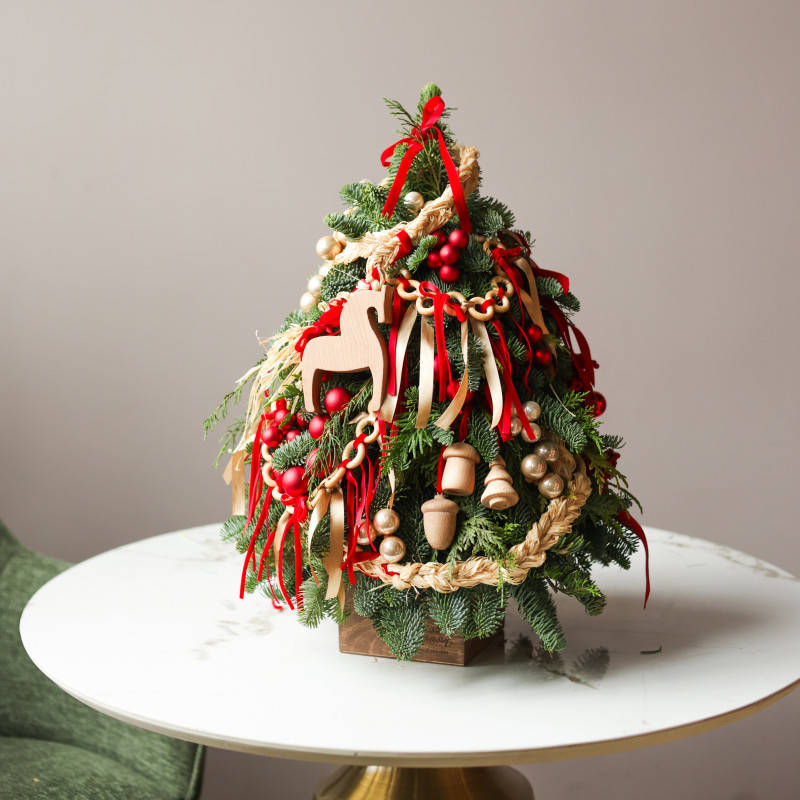 Настольная елочка ручной работы от студии «Тимьян Букет» с авторским фронтальным декором — воплощение теплой, душевной атмосферы. Выполнена из натуральной хвои, наполняющей пространство свежим ароматом леса и создающей подлинное новогоднее настроение. Фигурка деревянной лошадки в центре композиции, гирлянды баранок, миниатюрные деревянные игрушки и красные акценты создают ощущение уюта и семейного праздника. Елочка идеально подойдёт для оформления стола, комода, подоконника или каминной полки — везде, где хочется добавить ноту традиционного тепла и радости.