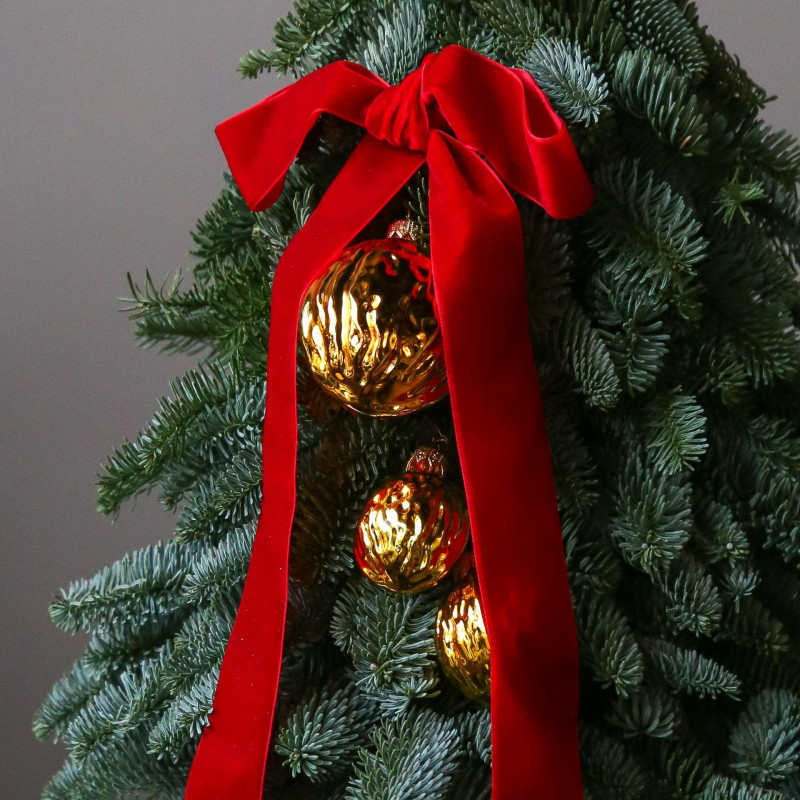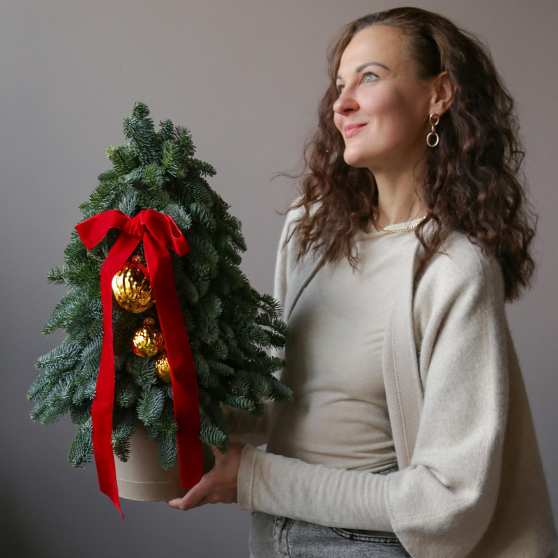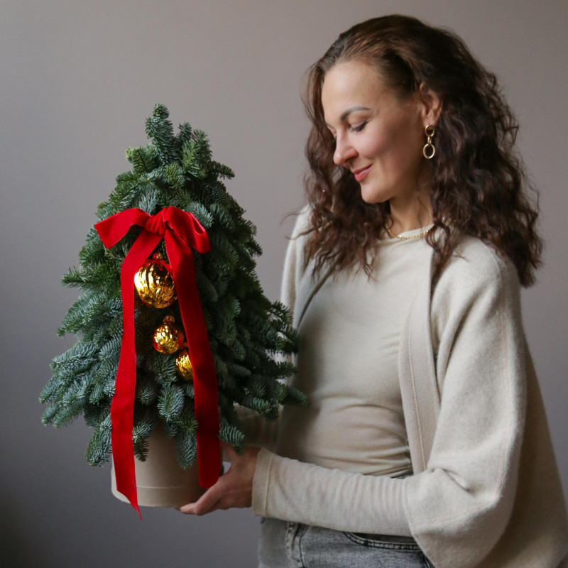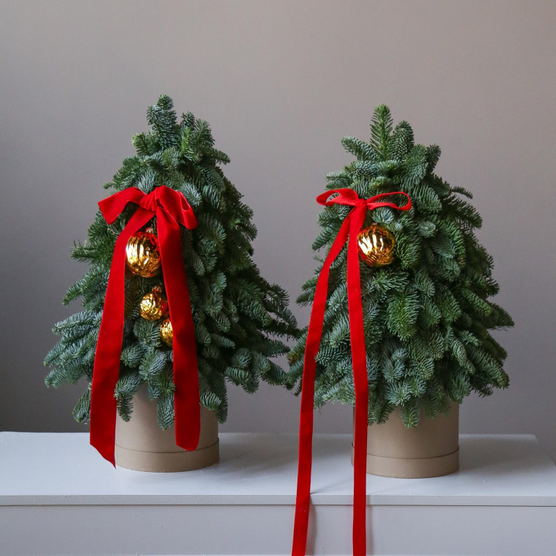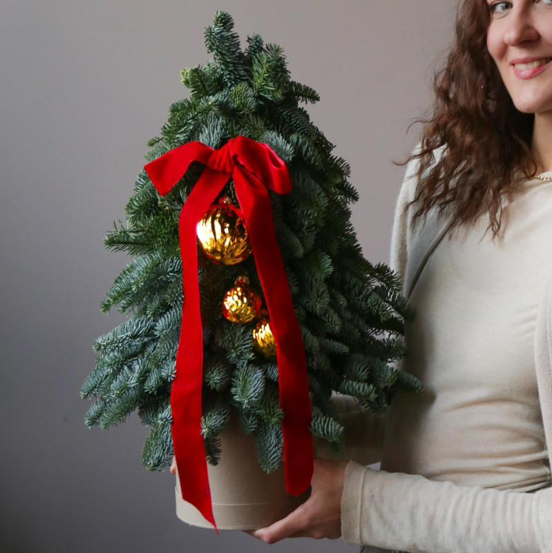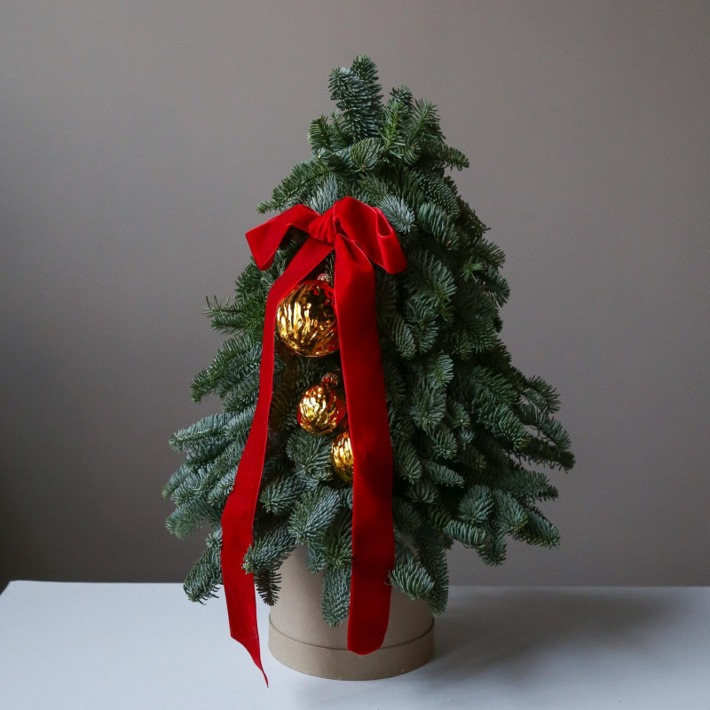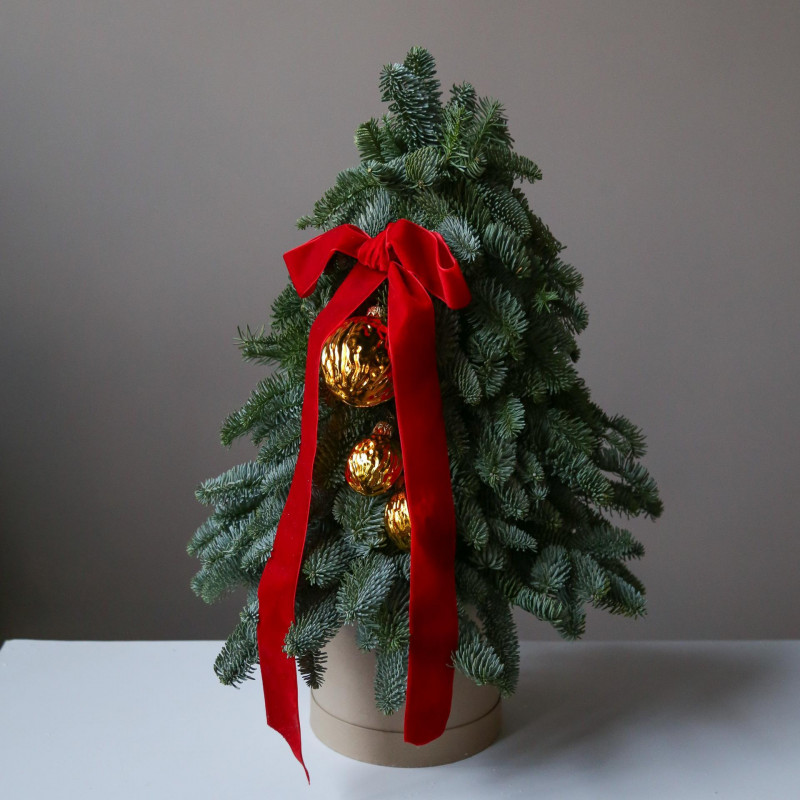 Стильная настольная елочка из живой пихты с красным бархатным бантиком и золотыми орешками станет очень лаконичным новогодним украшением вашего дома! Заказывайте с доставкой по Москве и московской области.