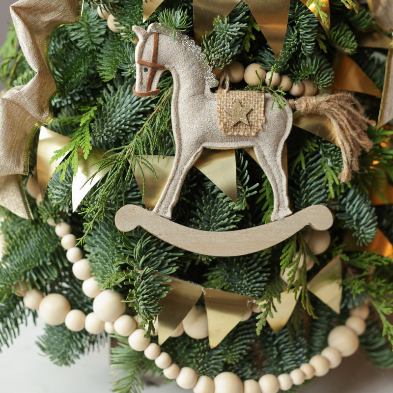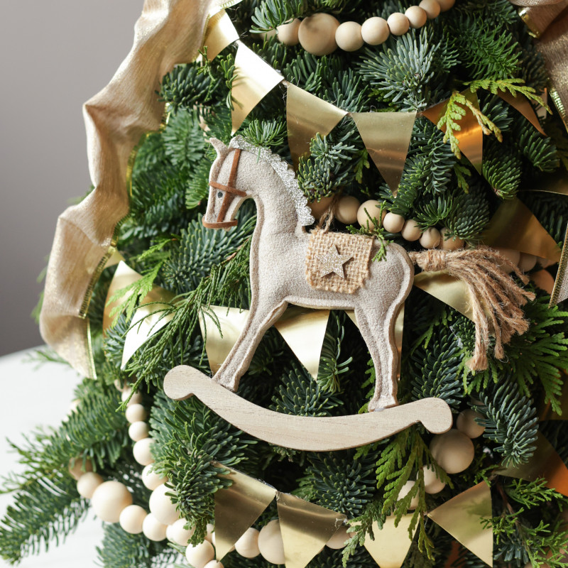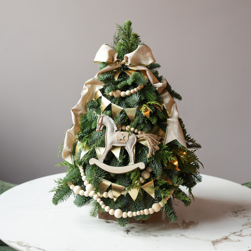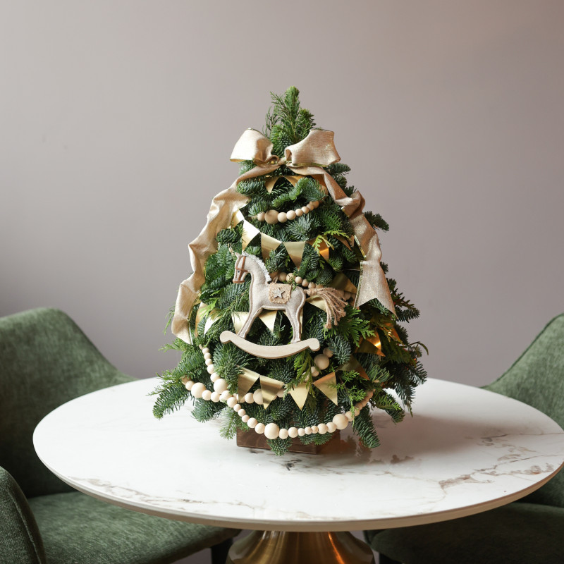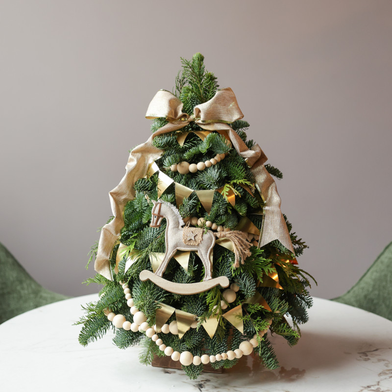 Тёплый праздничный акцент для вашего интерьера — настольная елочка ручной работы от студии Тимьян Букет. Выполнена из свежей пихты Нордмана, которая долго сохраняет насыщенный зелёный оттенок и приятный хвойный аромат. Авторский фронтальный декор в золотых и натуральных тонах создаёт атмосферу уюта и торжественности. Эта елочка станет замечательным украшением праздничного стола, комода, тв-консоли или рабочего уголка, добавляя нотку уюта и зимнего волшебства. Она сразу привлекает внимание и создаёт праздничное настроение в комнате.