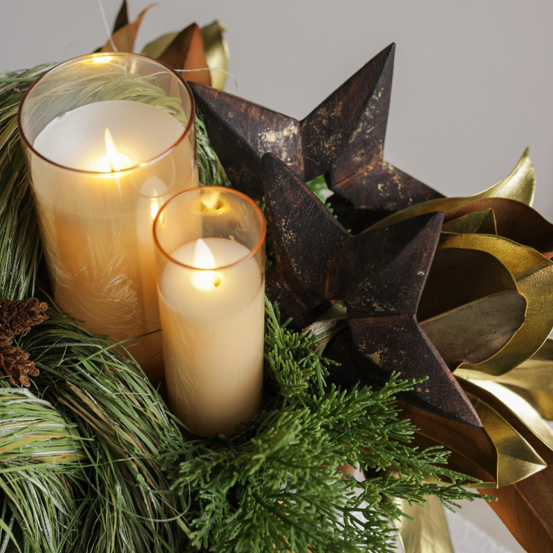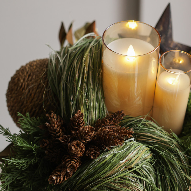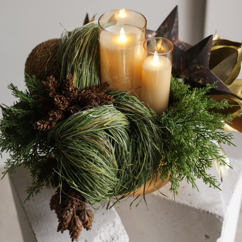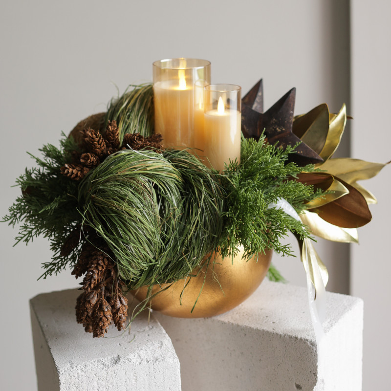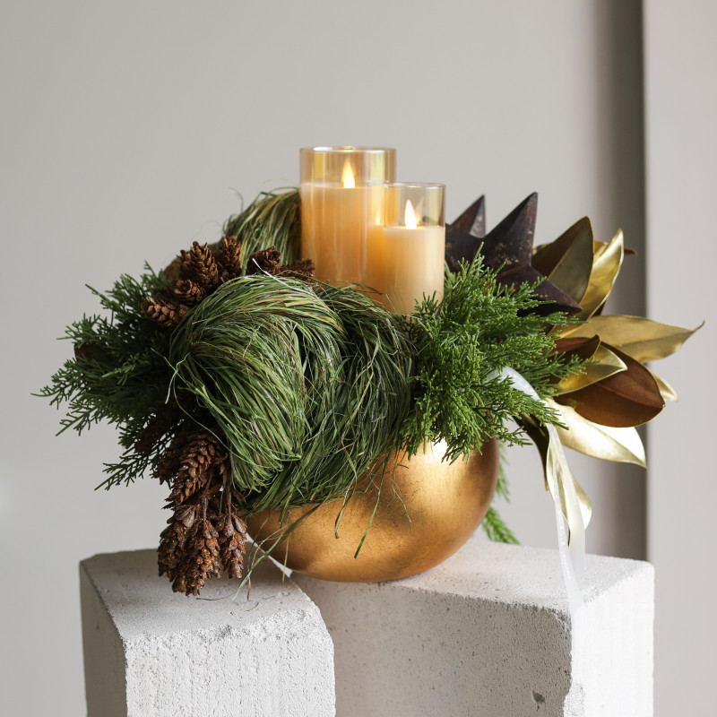 094. Композиция в золотом кашпо с эл. свечами и шишками