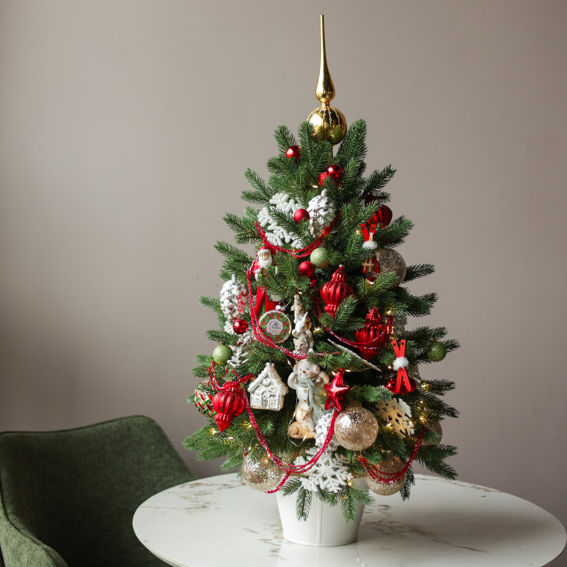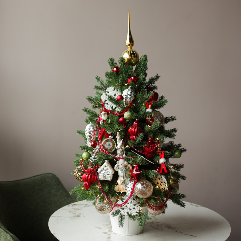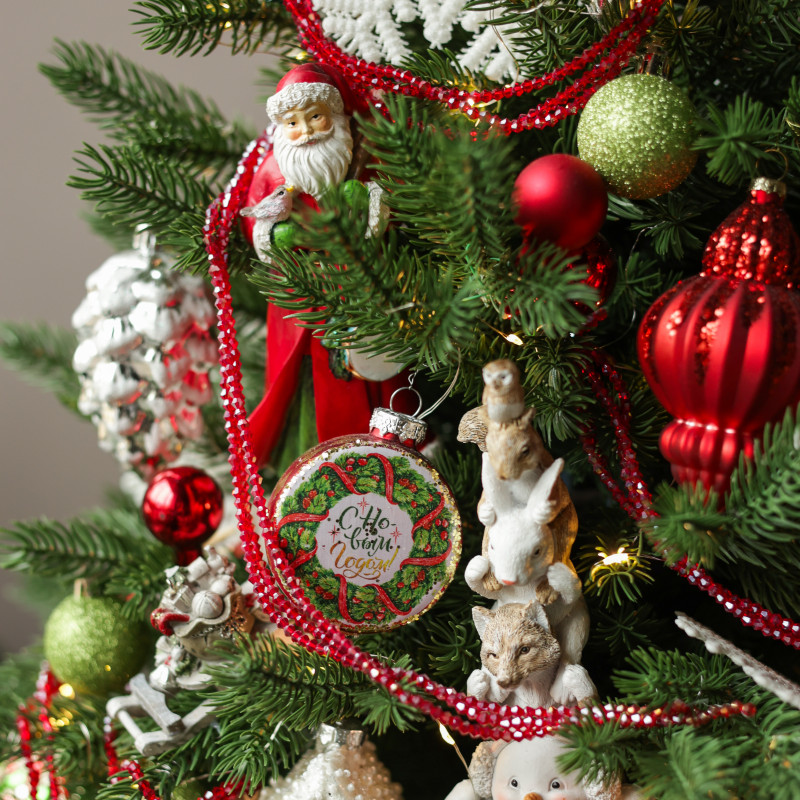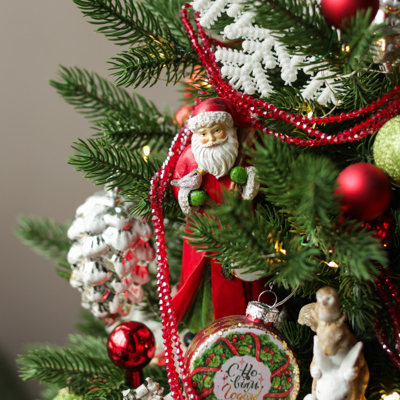 Настольная елочка ручной работы от студии «Тимьян Букет» с авторским фронтальным декором — праздничный акцент, создающий атмосферу зимнего волшебства. Выполнена из искусственной хвои, которая долго сохраняет свежий и ухоженный вид, наполняя интерьер праздничным настроением. Верхушка украшена золотым шпилем, а композицию дополняют шарики, красные фонарики, красные бусы, прозрачные золотые шарики, белые снежинки, деревянные лыжи, фигурка Деда Мороза и жемчужный домик. Центральный элемент — фигурка снеговика с пирамидой из лесных жителей на голове, придаёт елочке особый характер и праздничную игривость. Идеальна для украшения стола, комода, тв-консоли или журнального столика.