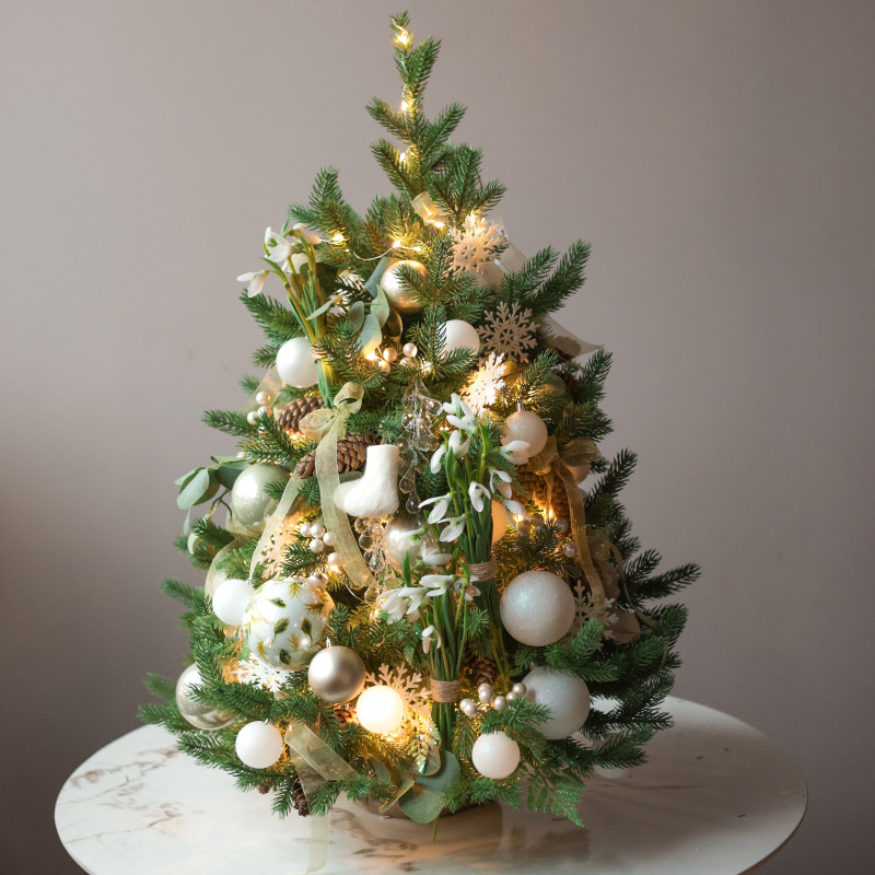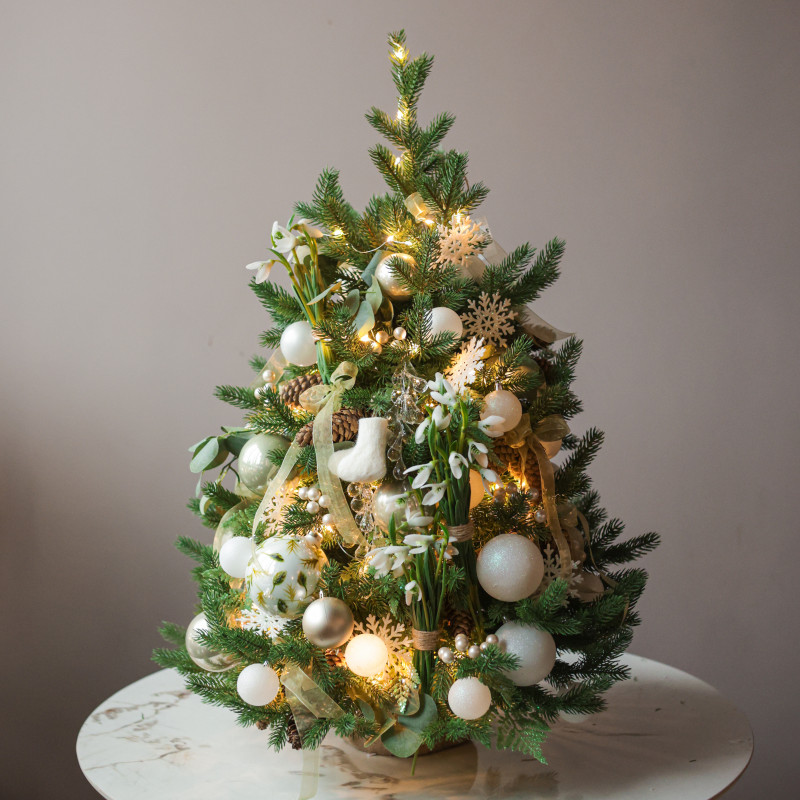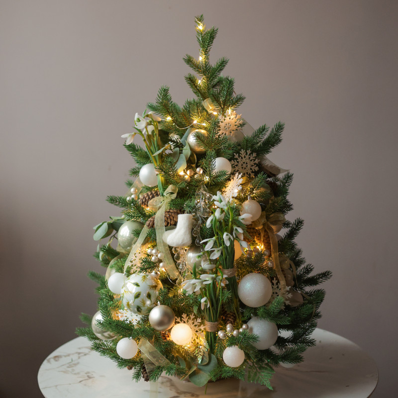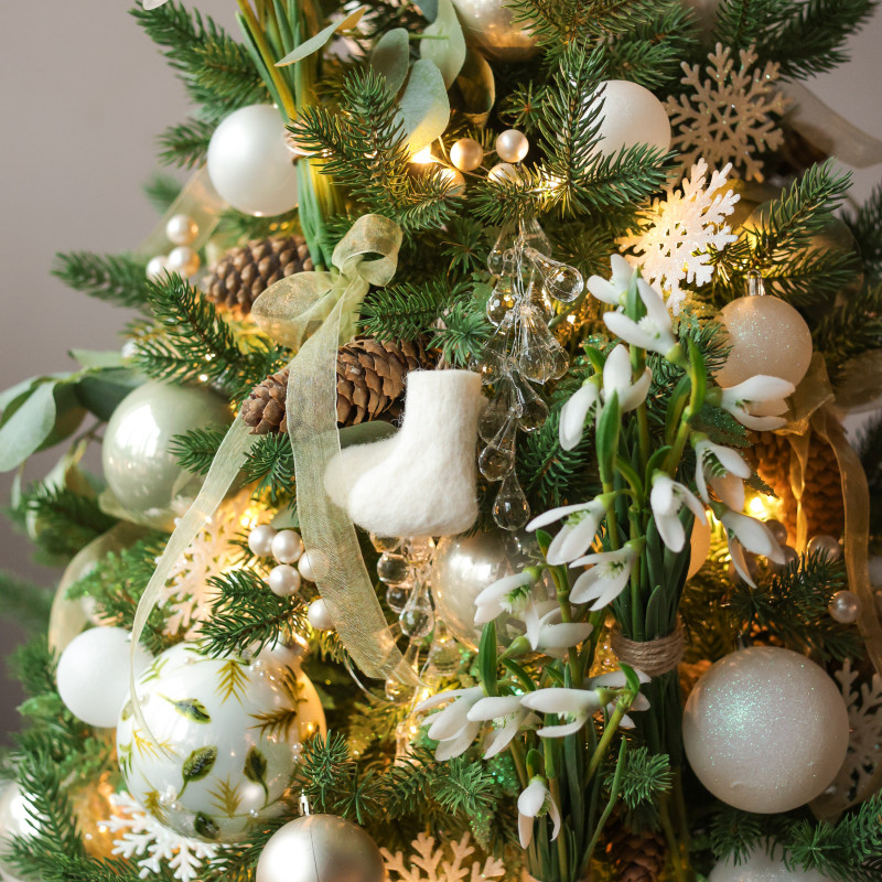 Авторская эксклюзивная елка из искусственной литой хвои «Подснежники» с авторским фронтальным декором. Искусственные премиального качества подснежники, снежинки и шарики создают нежную зимнюю атмосферу, а диодная гирлянда на батарейках добавляет мягкое сияние и праздничное настроение.